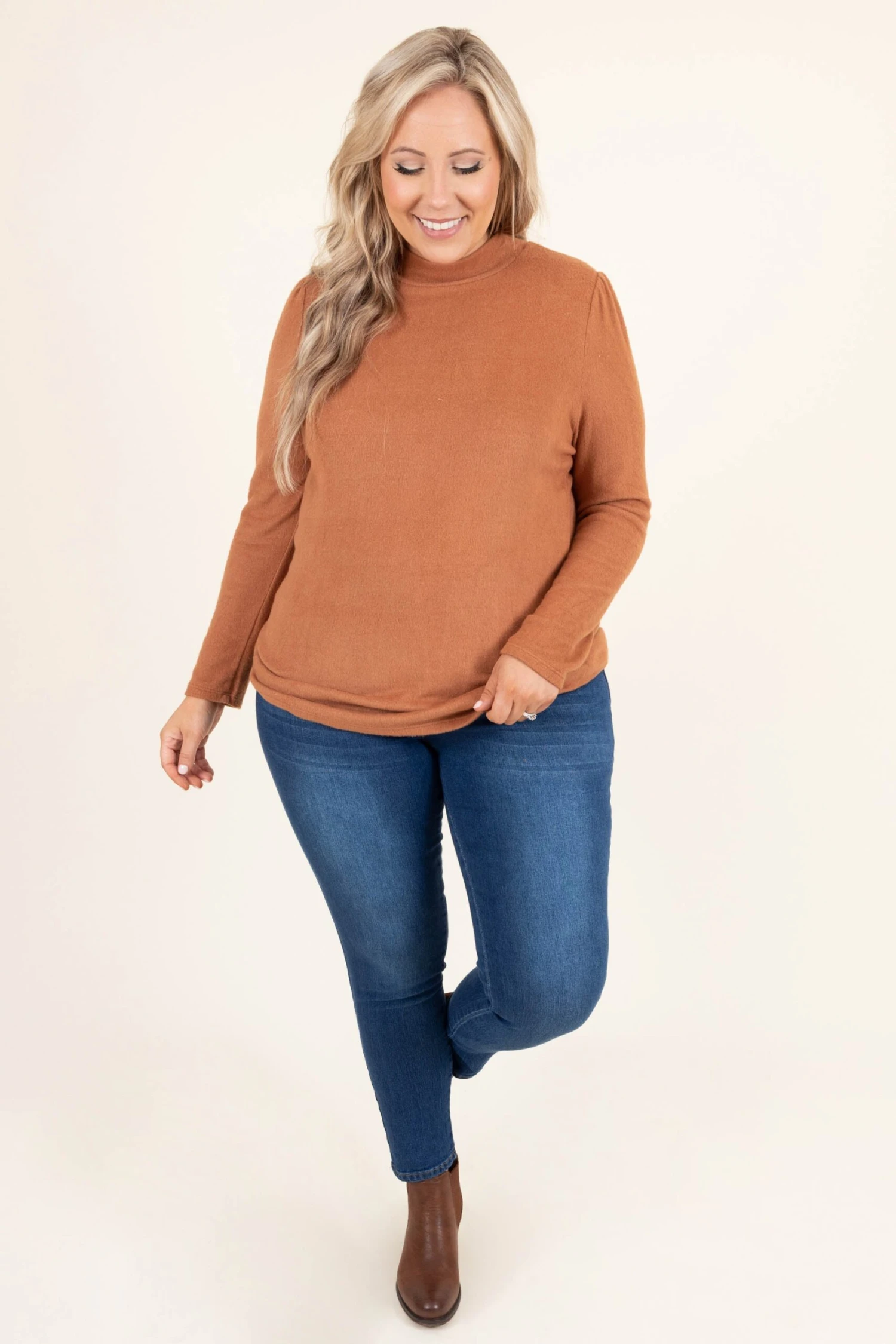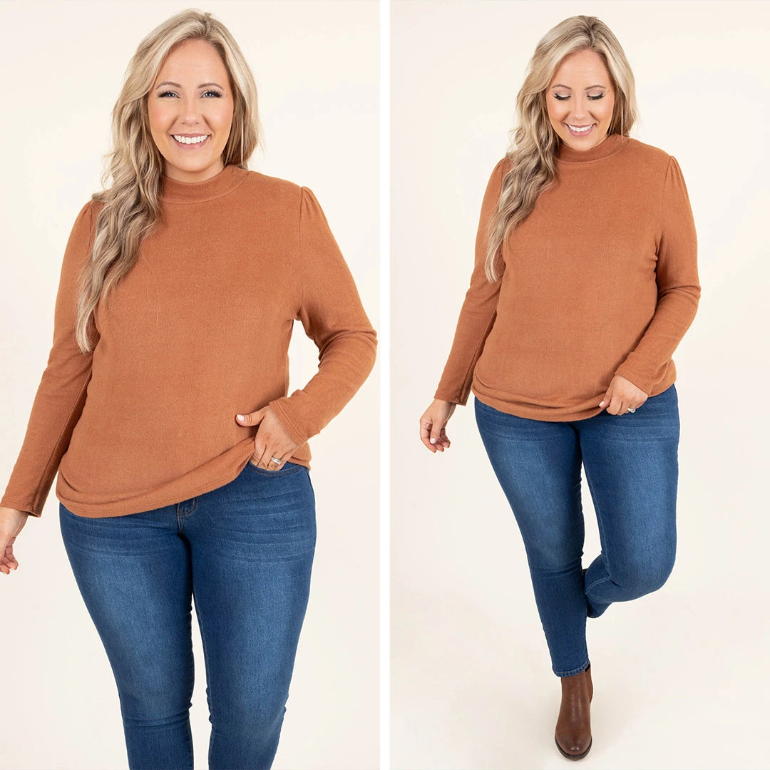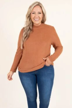 This top makes us so happy! The gorgeous brick color, high neckline, and soft material are SO cute and cozy! The figure flattering fit and stretchy material are perfect for all day wear this season! Style this top with some skinnies and booties for a trendy, chic look!