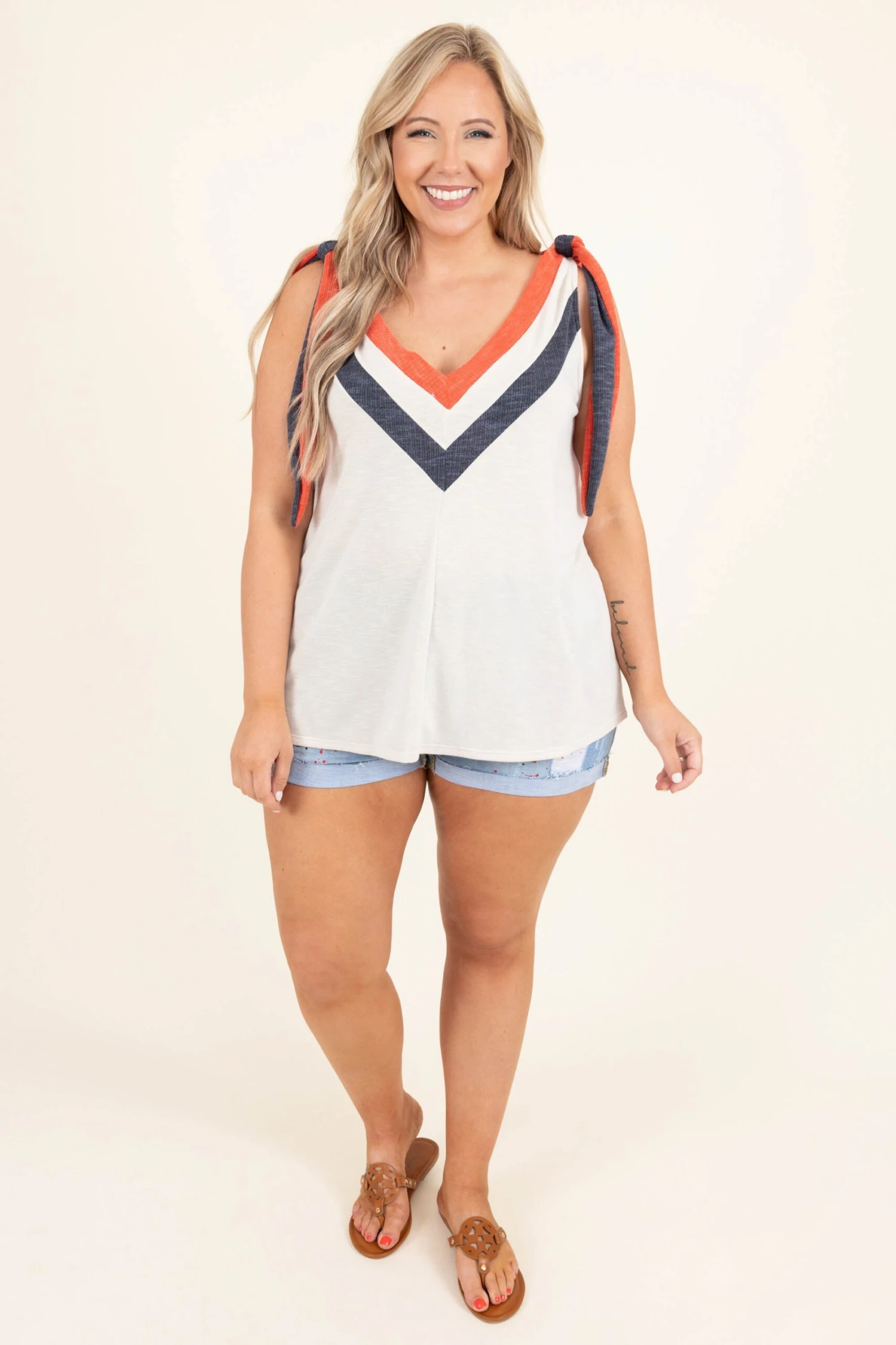 Wear this top on the fun American nights! The oatmeal color can be paired with anything and the tie straps are so trendy! We love the chevron pattern at the neckline that gives this a fun feel! Style it with some shorts and sandals for a totally chic look!
