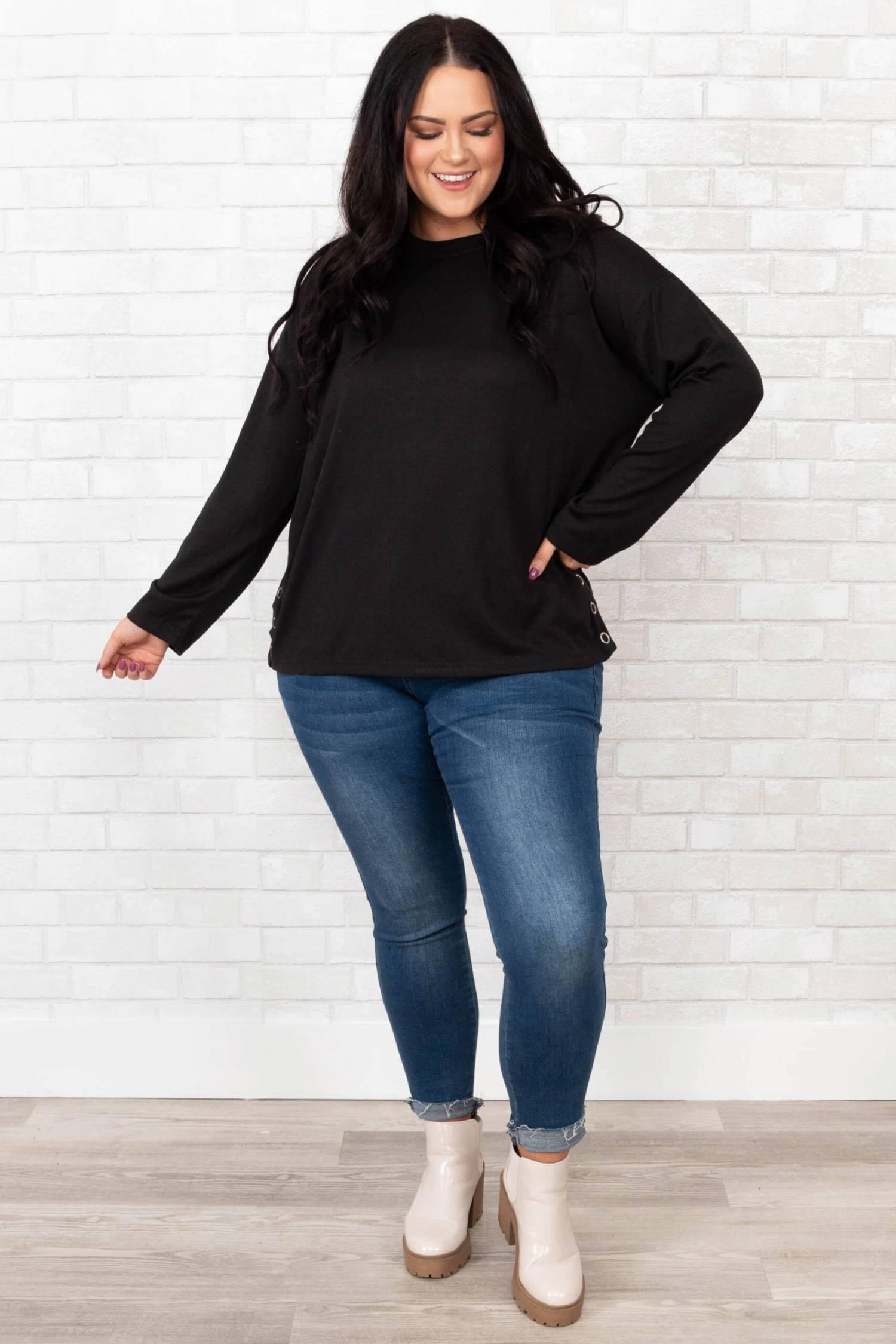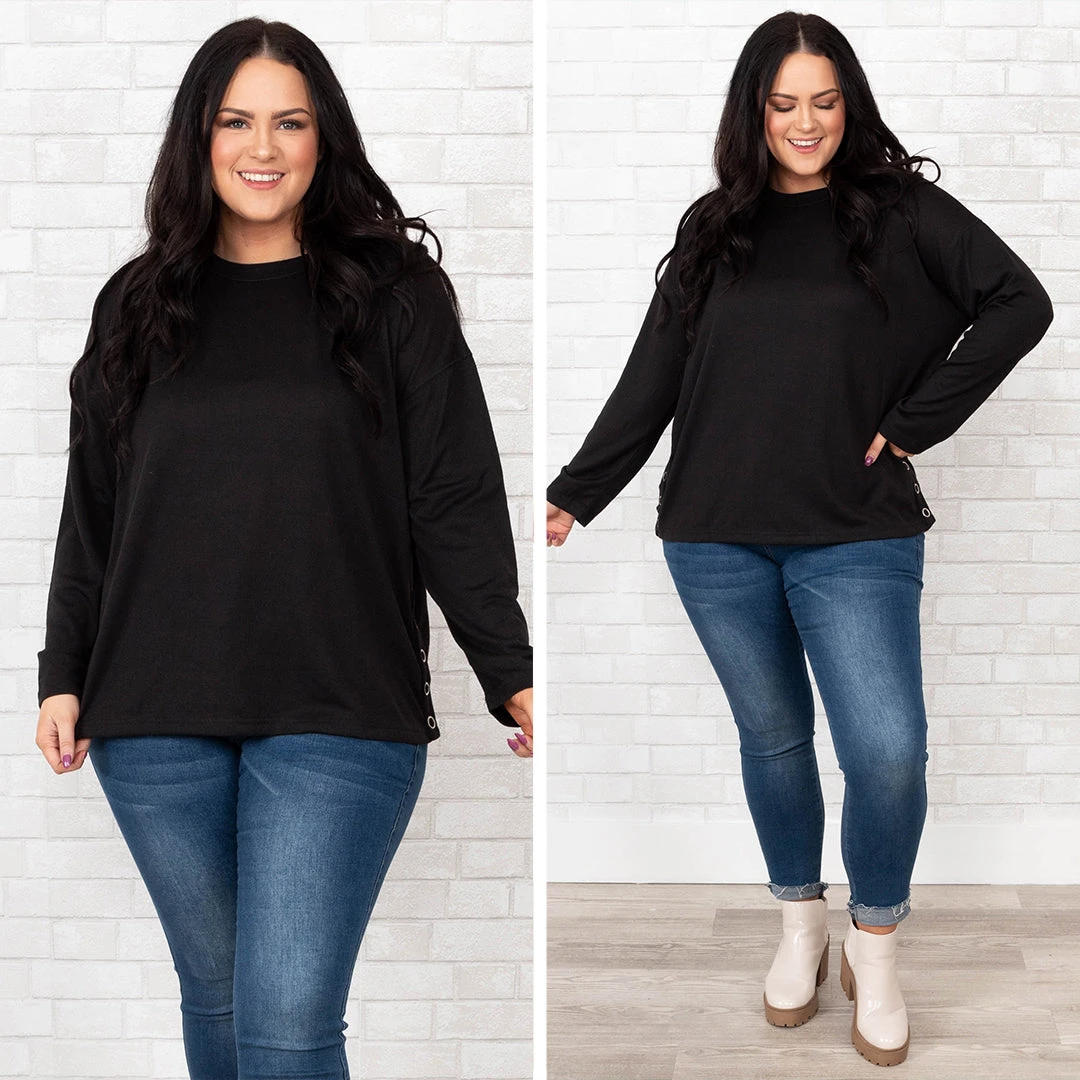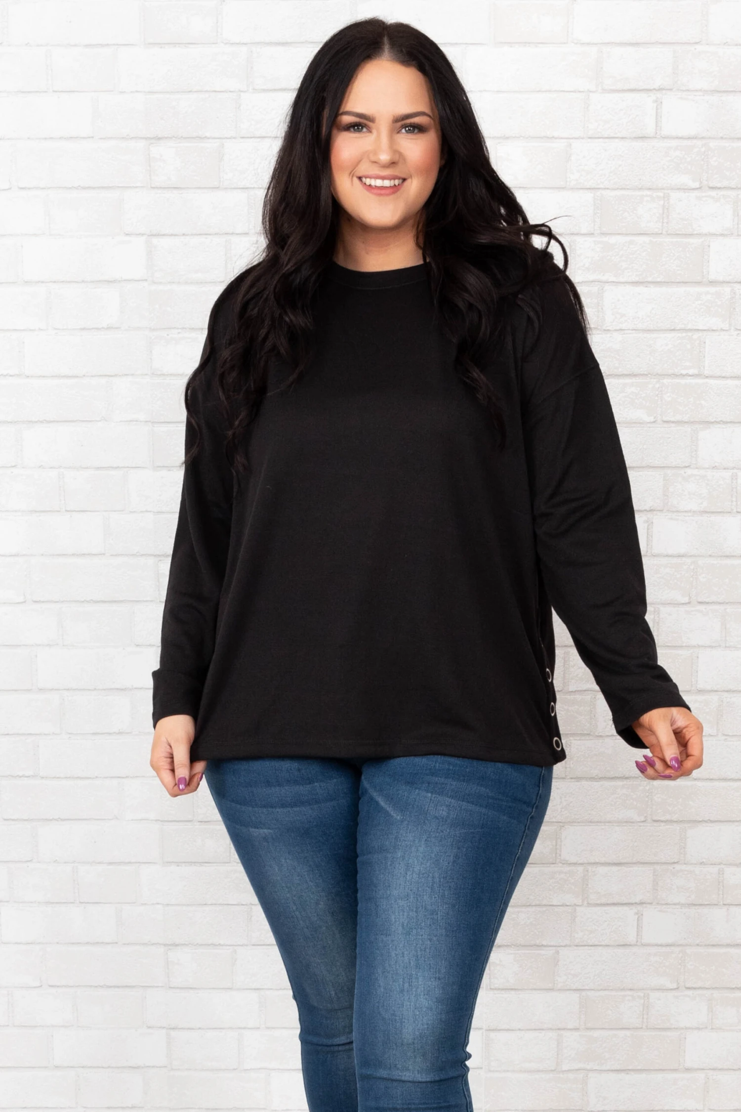 This top has been long awaited! It has a classic black color with trendy silver snaps on the sides. Style this top with a scarf and jeggings for a cozy chic outfit!