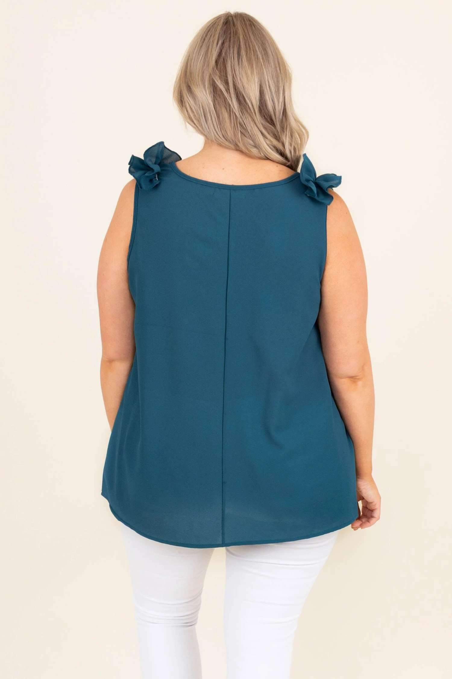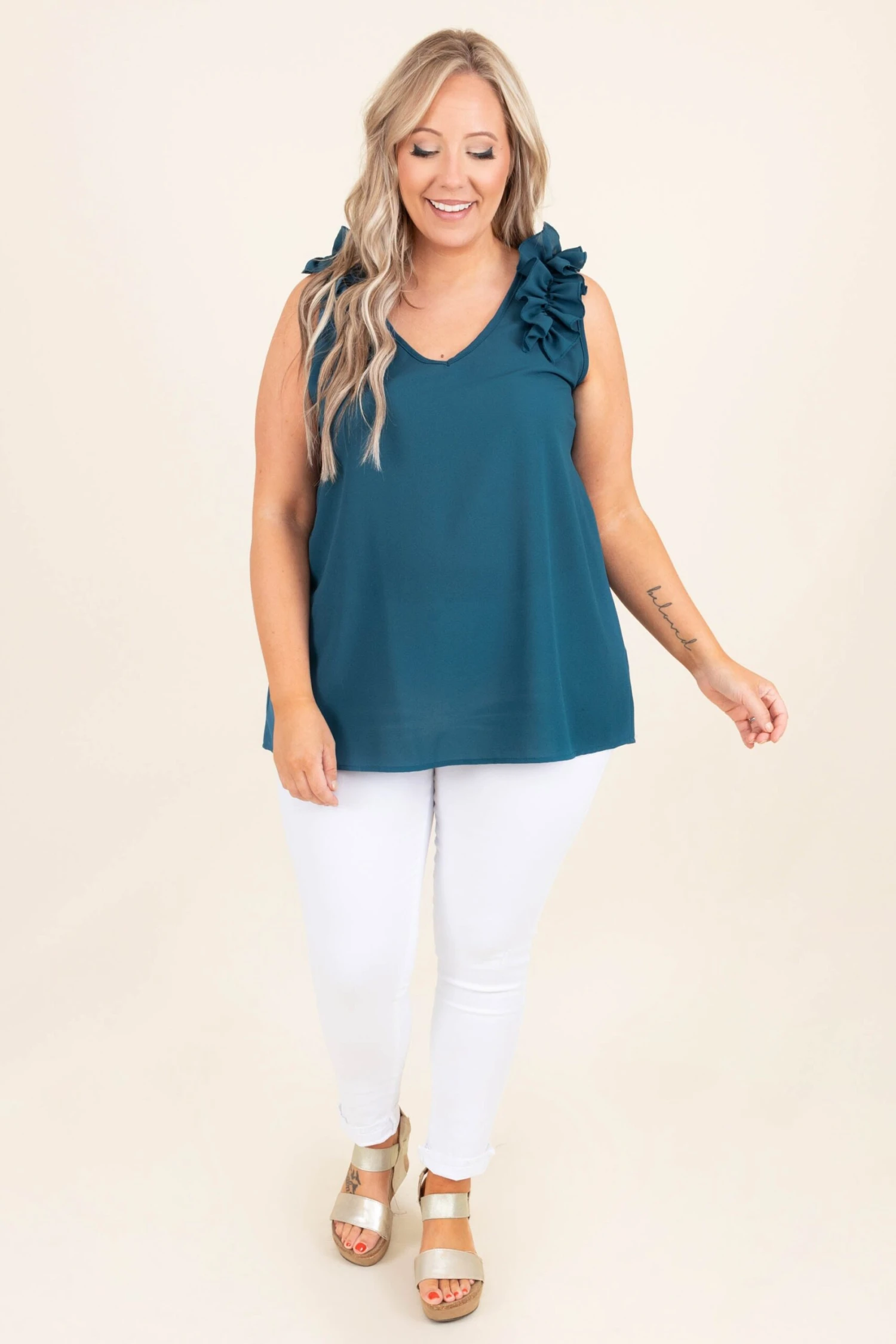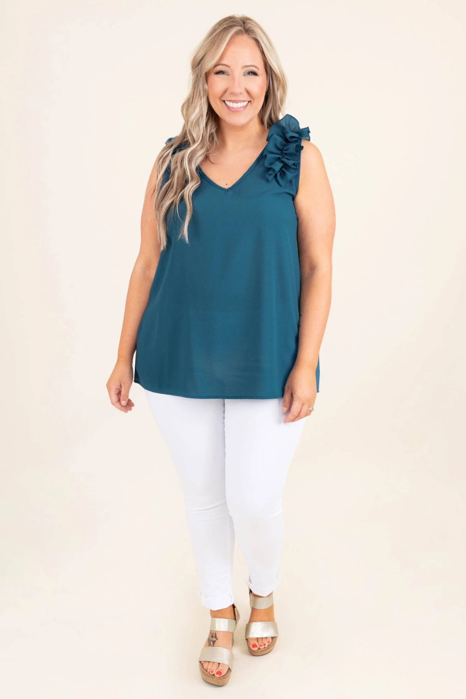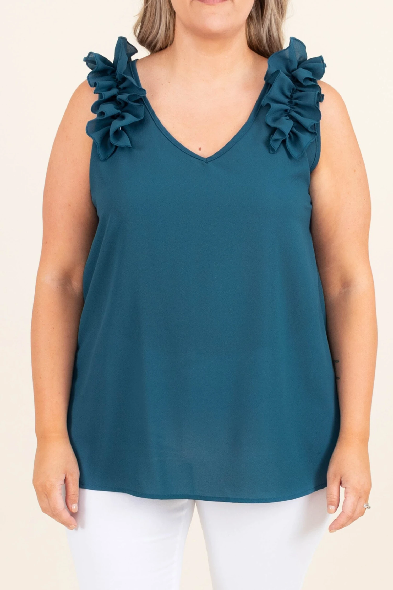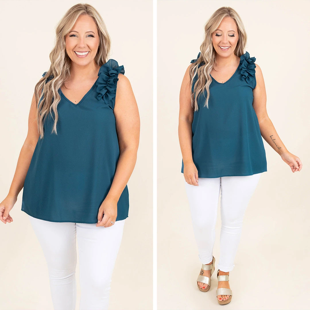 Everyone will be borrowing this cute top from you! The solid teal color is so pretty and the ruffles on the sleeves are so fun! Wear this cutie to the office or to lunch with your gals for a super cute look! Style it with white or regular skinnies for a perfect everyday look!