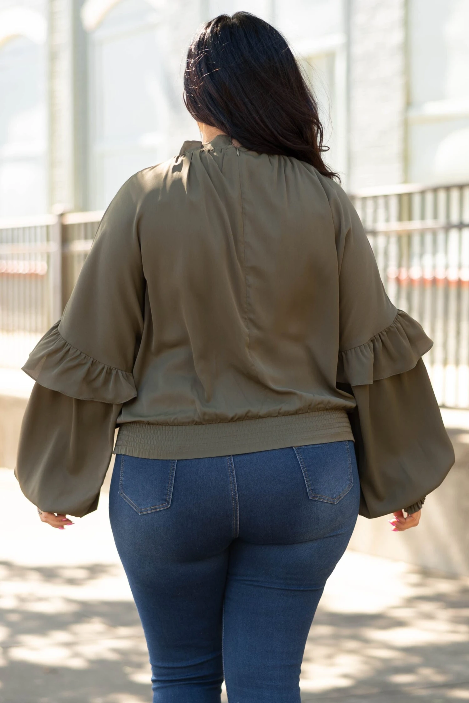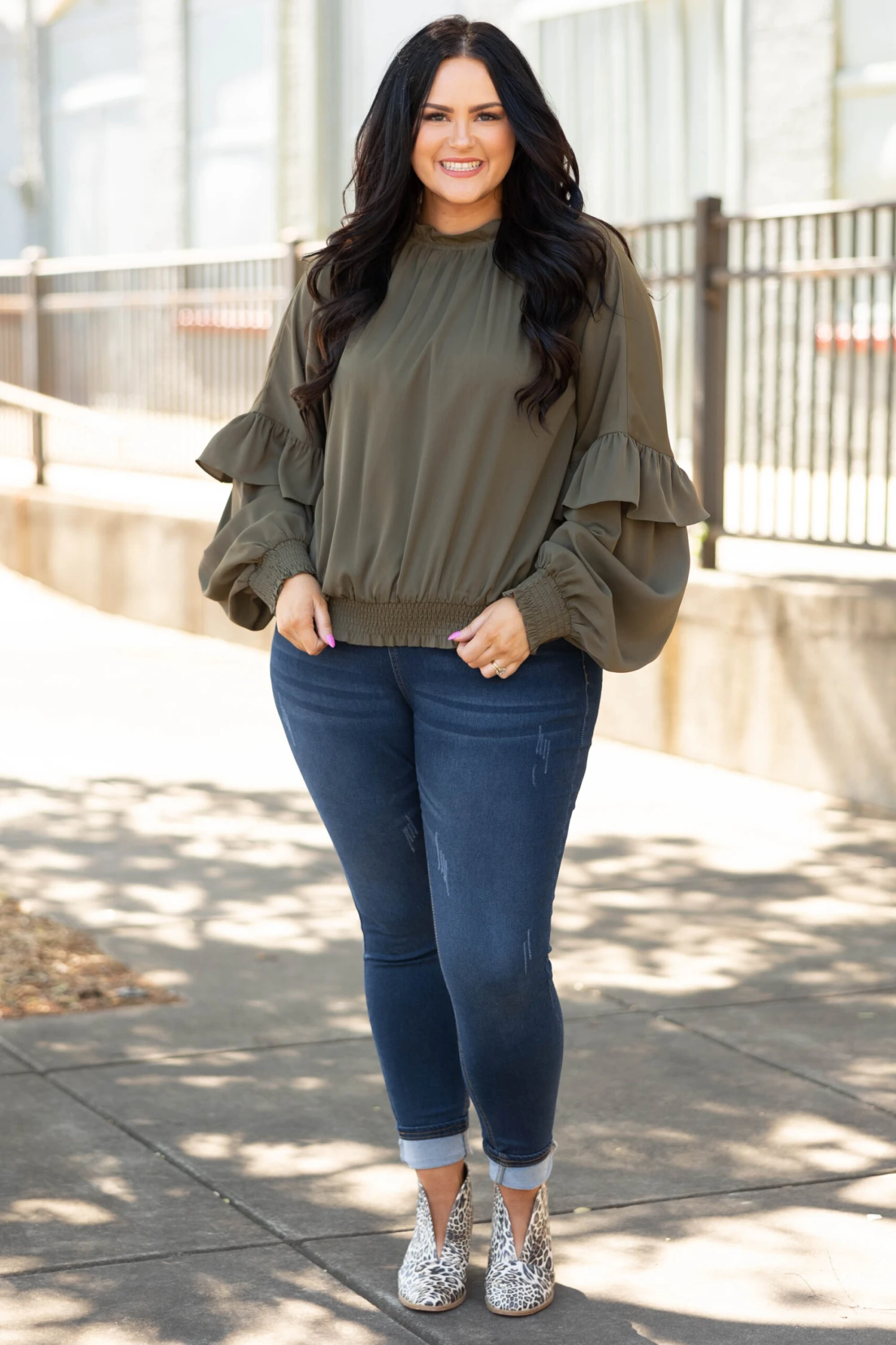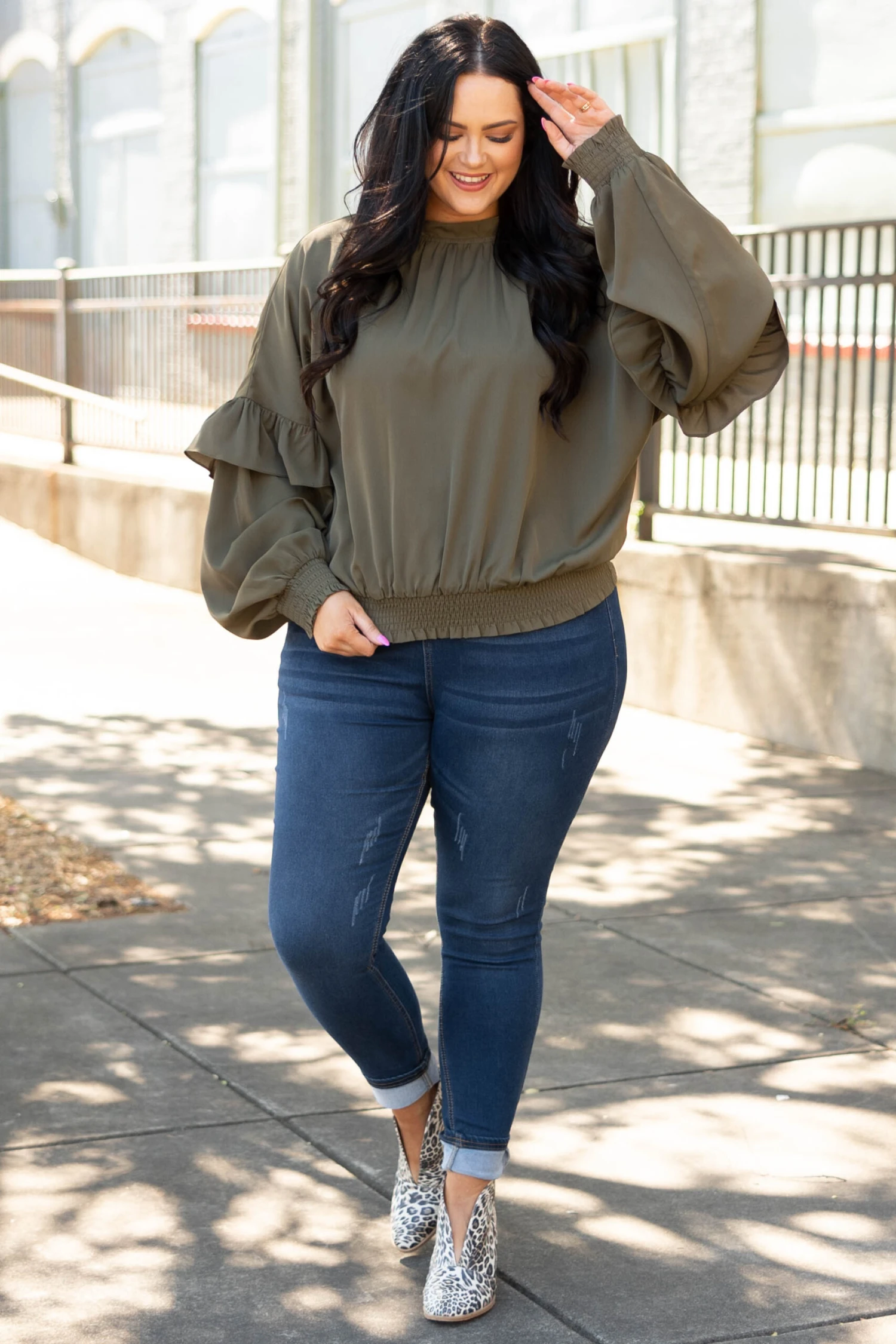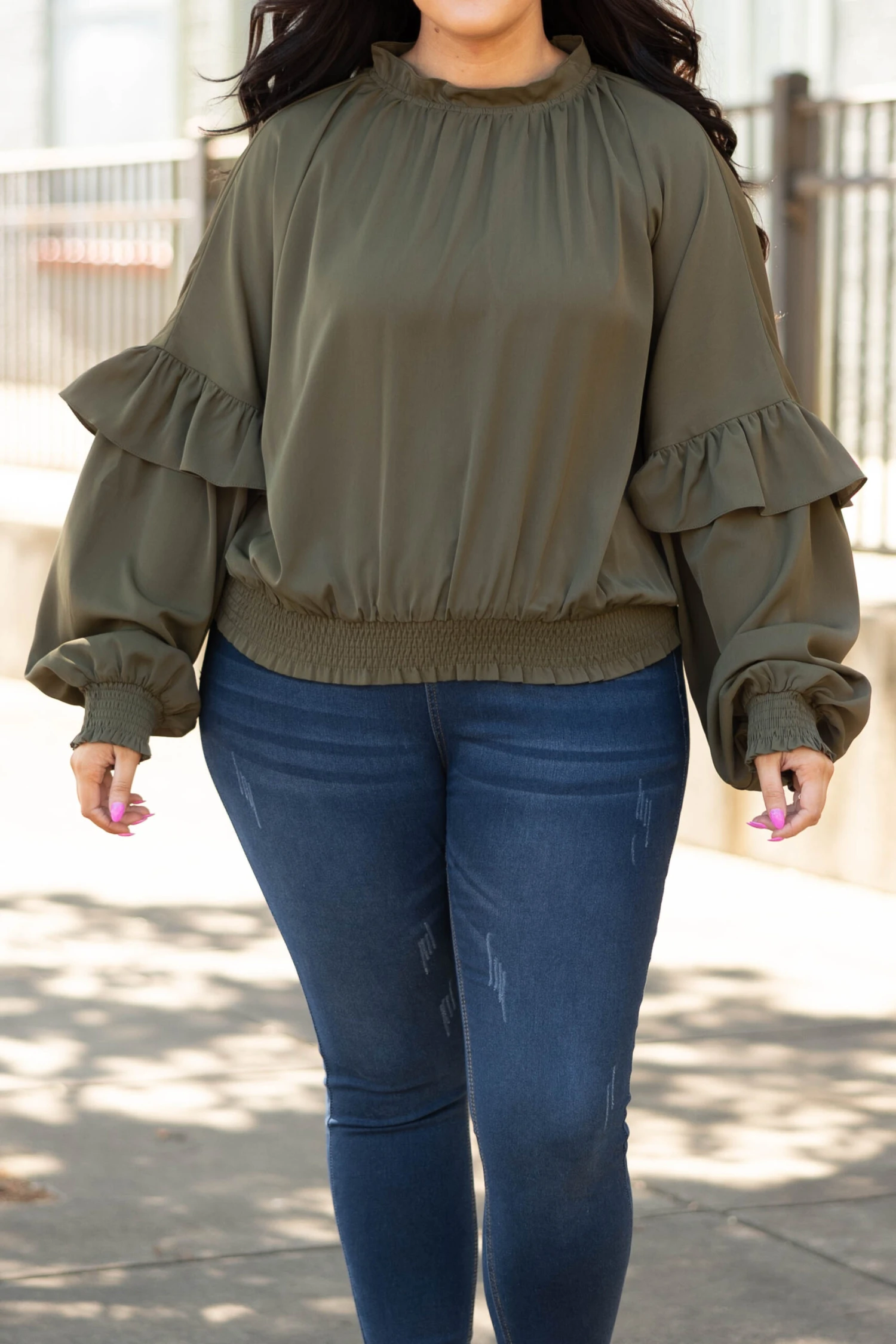 You’ll have charming memories in this beauty! This top has a solid green color and a lovely ruffled high neckline! The ruffles along the sleeves and elastic hemline is perfect for paring with all of your faves this season! Style this top with some skinnies and booties for a sassy chic look!