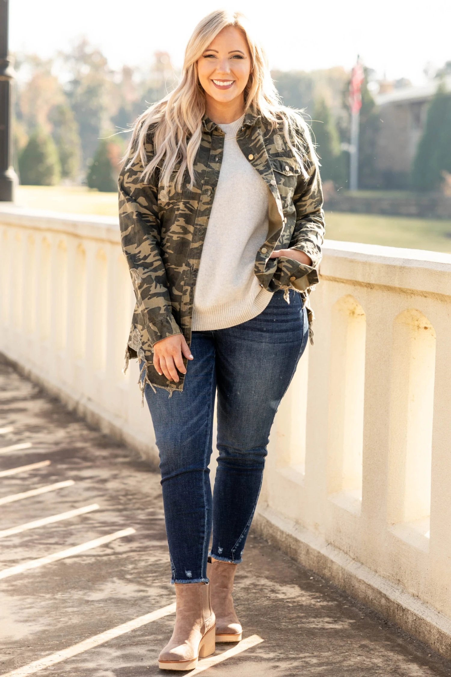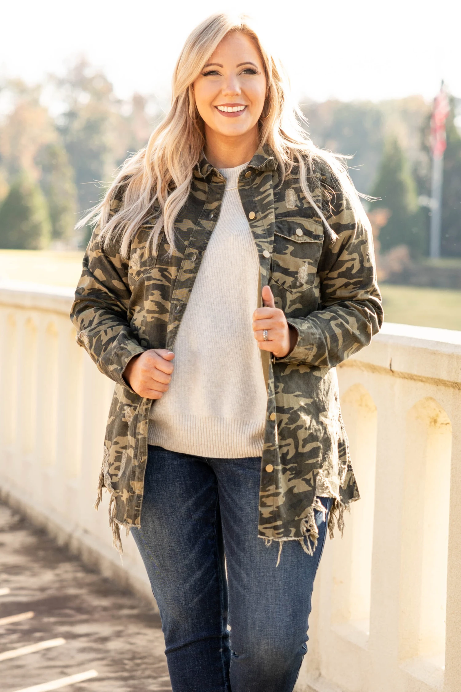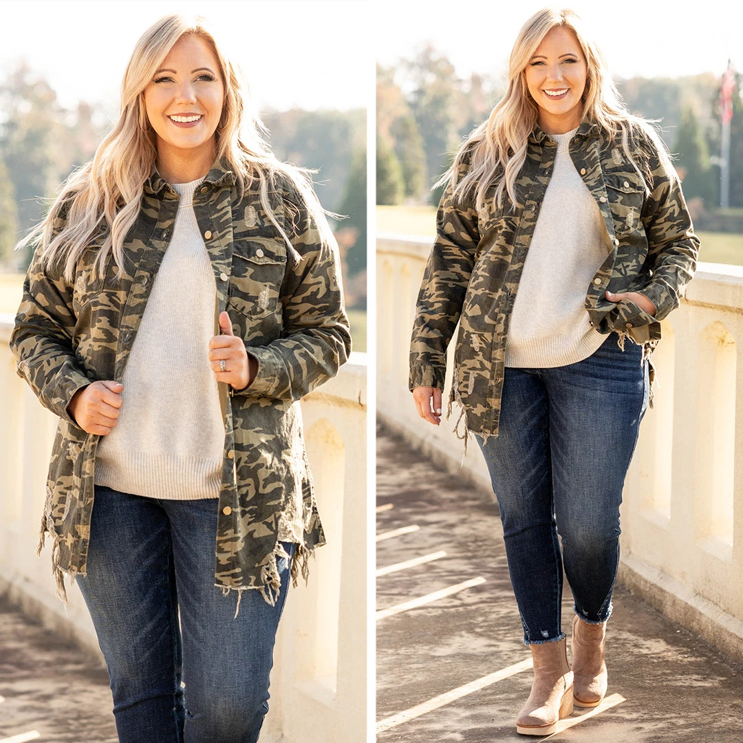 This chill top is just what your wardrobe has been missing! It has a classic denim fabric with an olive camo print you can style for every occasion! It features a button-front, a distressed hemline, and can be worn alone or as a layered look! Style this top with a basic tee and shorts for an effortlessly chic outfit!