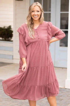 This dress is a total dream! It has a pretty pink color with a raised polka dot pattern that is a season favorite! The midi length and flowy style makes this the perfect go-to dress for the season! Style this dress with sandals and cute accessories for a classy chic look!