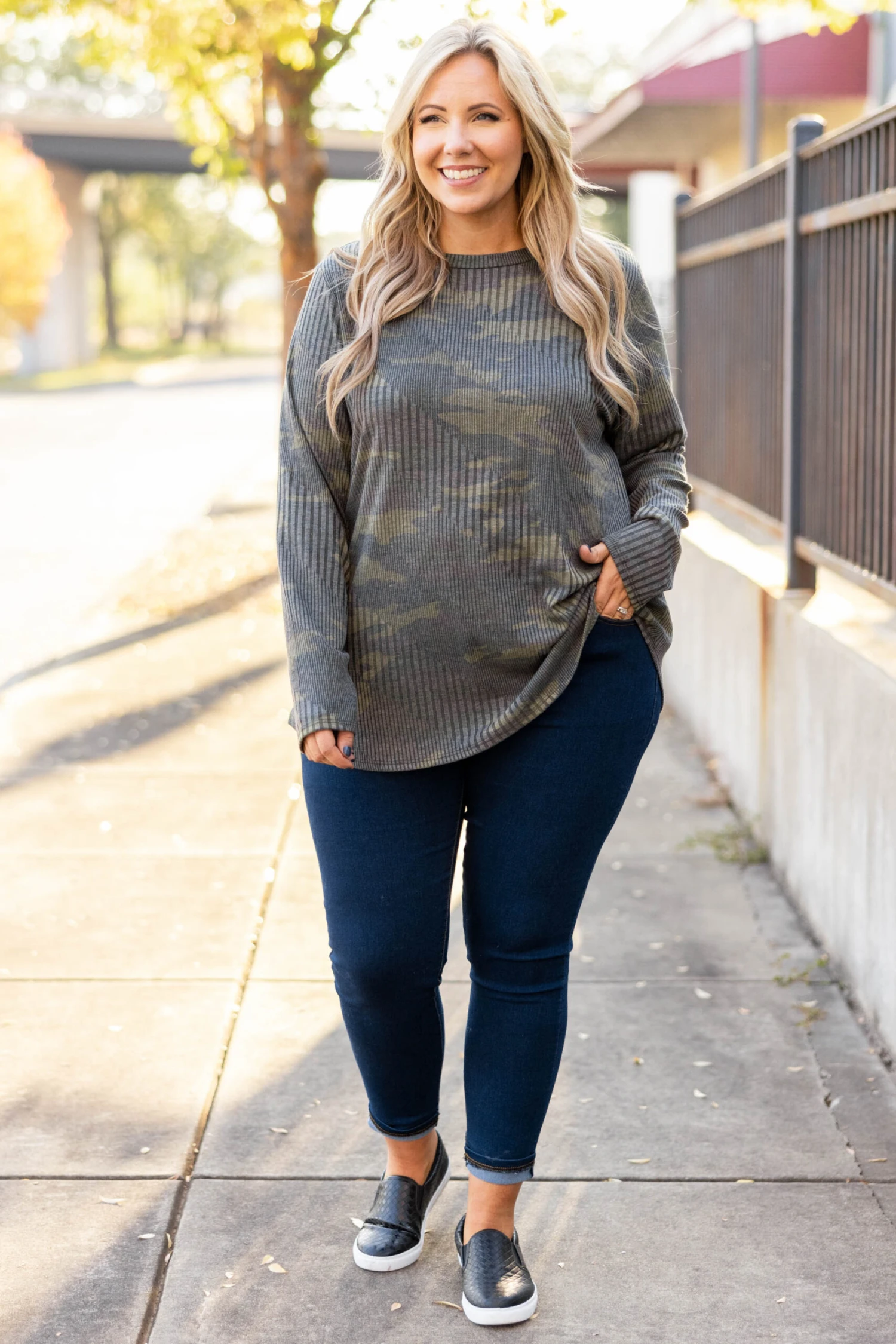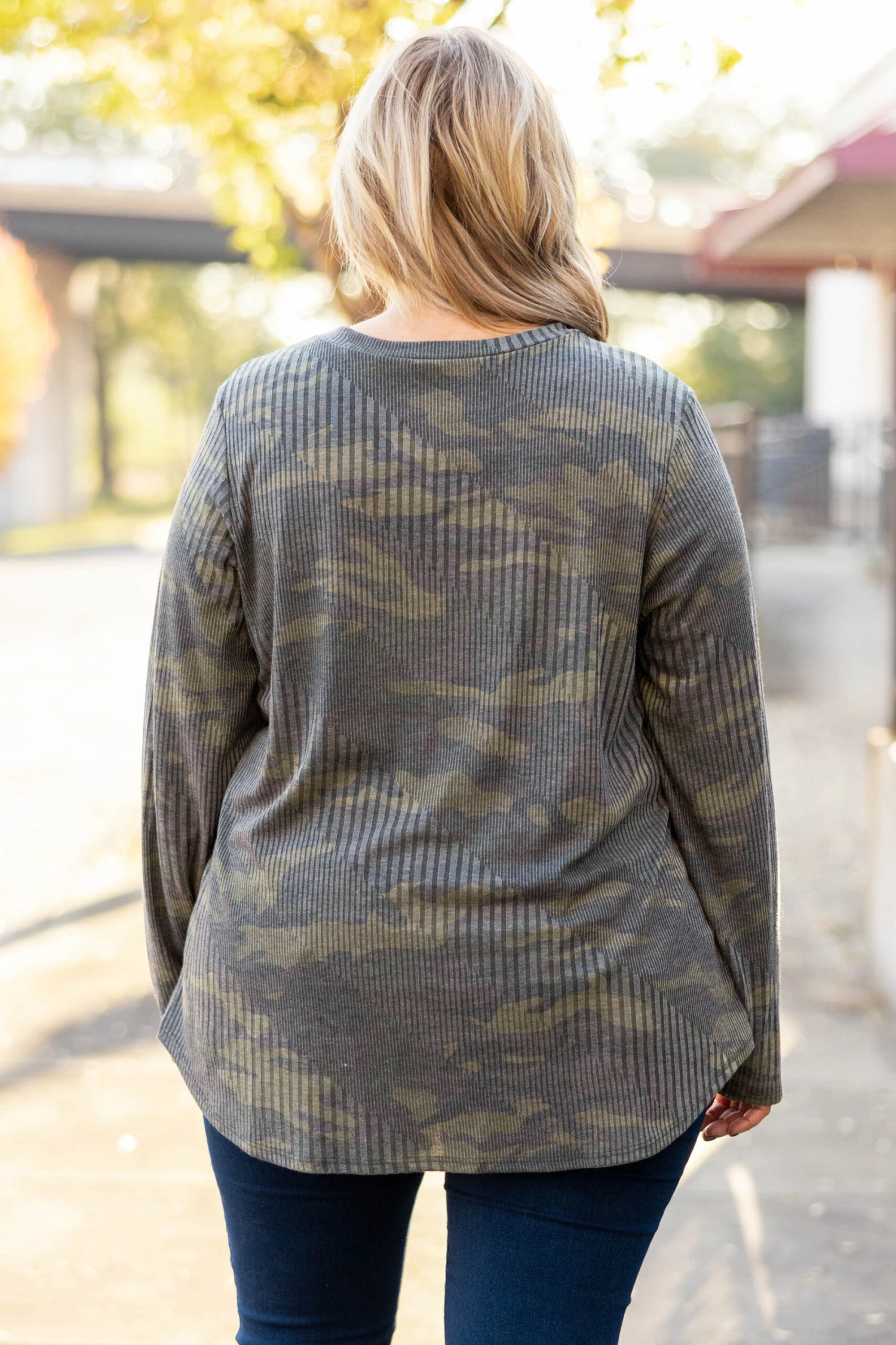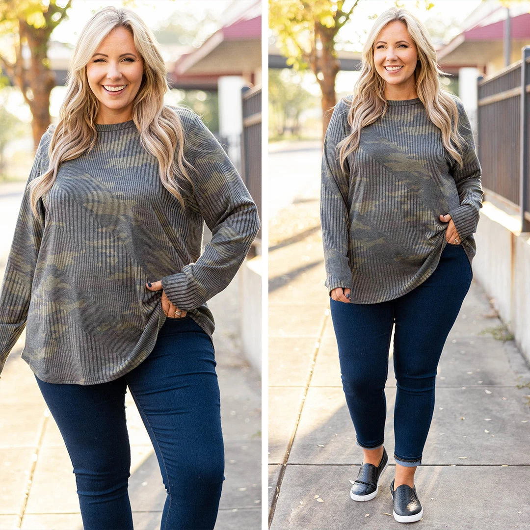 This top is a fashion dream! It has a beautiful camo pattern that is perfect for the season! The textured design is so chic! The lightweight, figure flattering fit is great for all day wear! Style this top with skinnies or leggings for a trendy casual look!