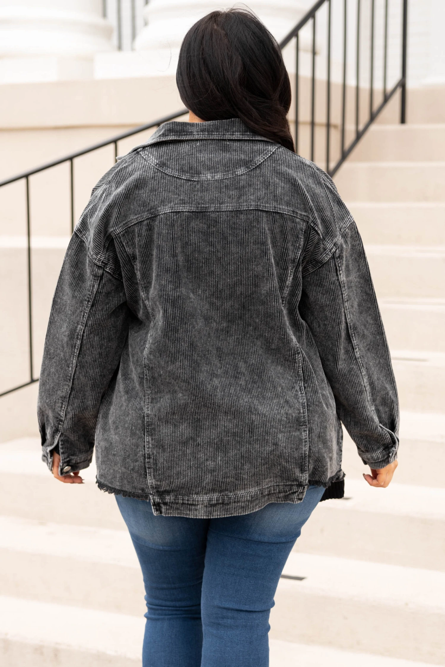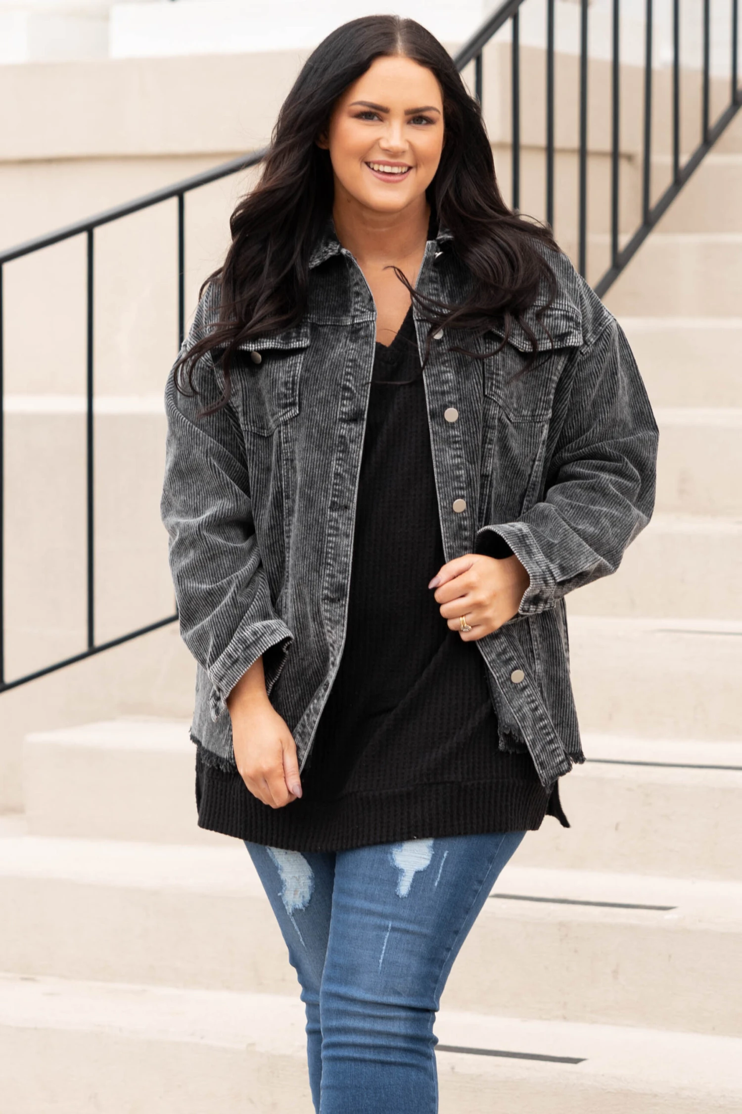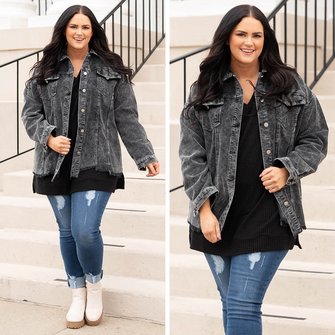 Get a glimpse of you wearing this beauty! This jacket has a neutral black color and a trendy acid wash design that is so fierce! The ribbed texture and distressed hemline is perfect for your new favorite layering piece!Â