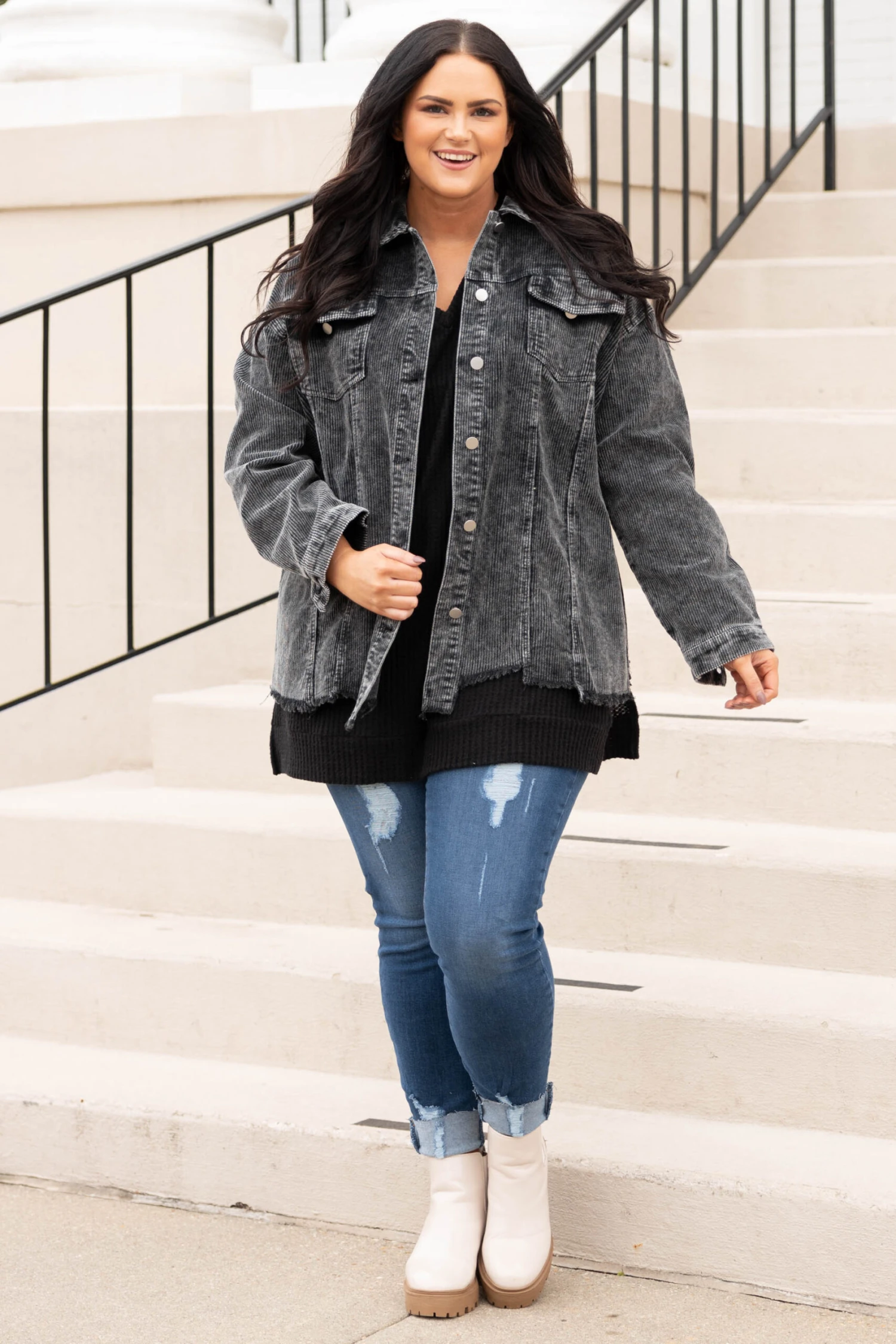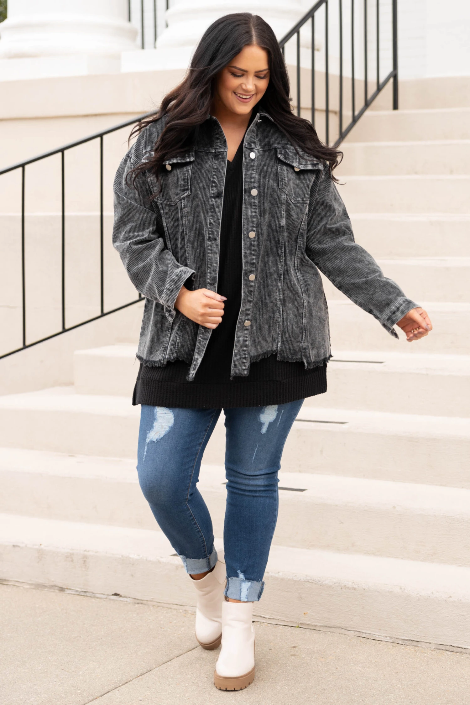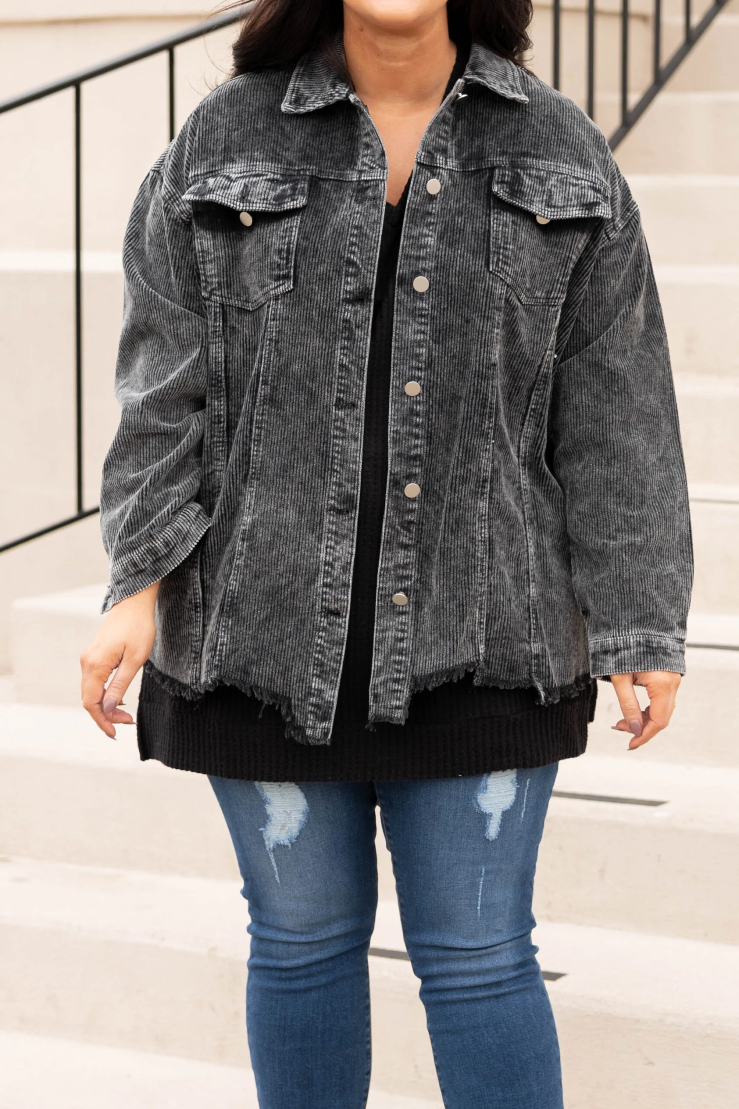 Get a glimpse of you wearing this beauty! This jacket has a neutral black color and a trendy acid wash design that is so fierce! The ribbed texture and distressed hemline is perfect for your new favorite layering piece!Â