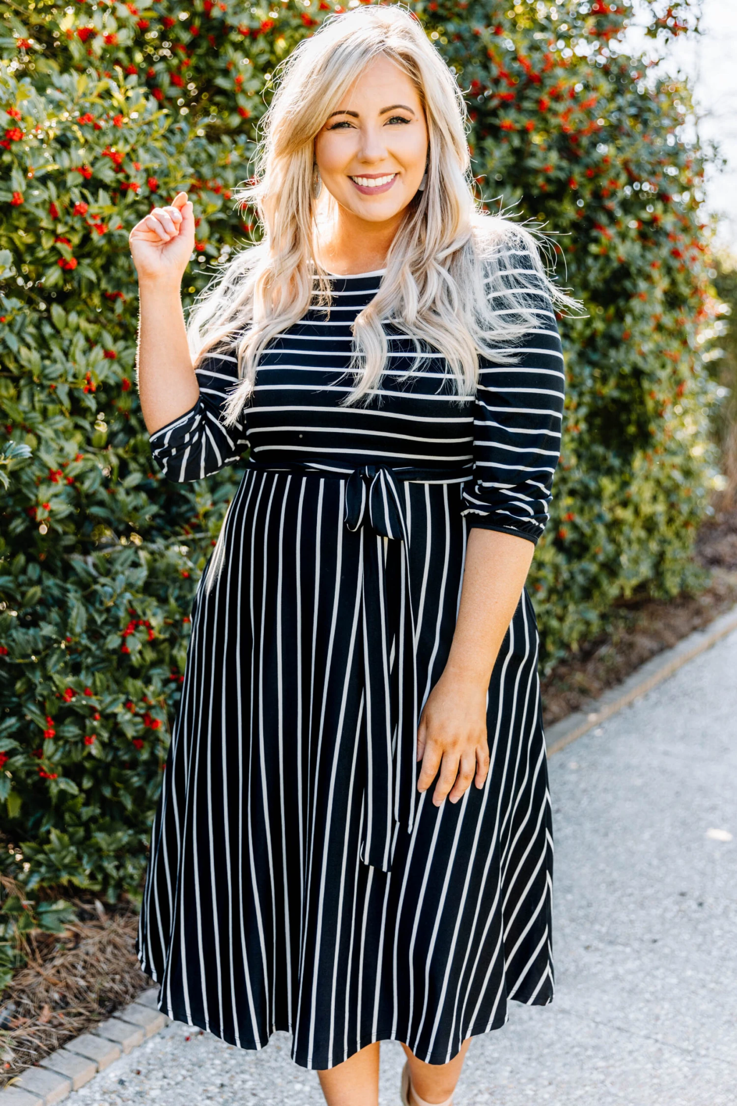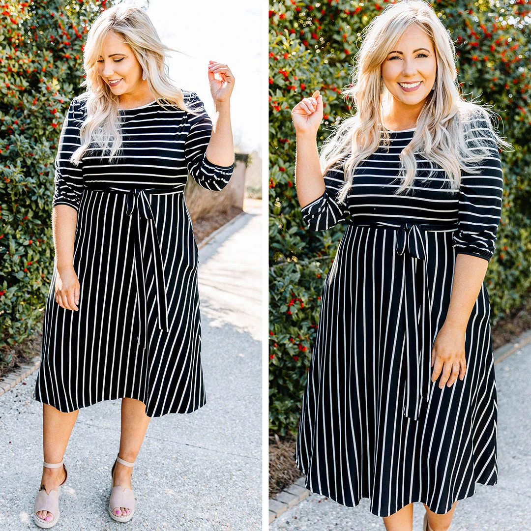 Hold hands with your love when you’re wearing this dress! This dress has the prettiest stripe pattern with a soft black color you can style for every occasion! It’s comfortable for all day wear, has a tied waistline to flatter your figure, and even features pockets! Simply style this dress with heels or wedges for your next date night!Â