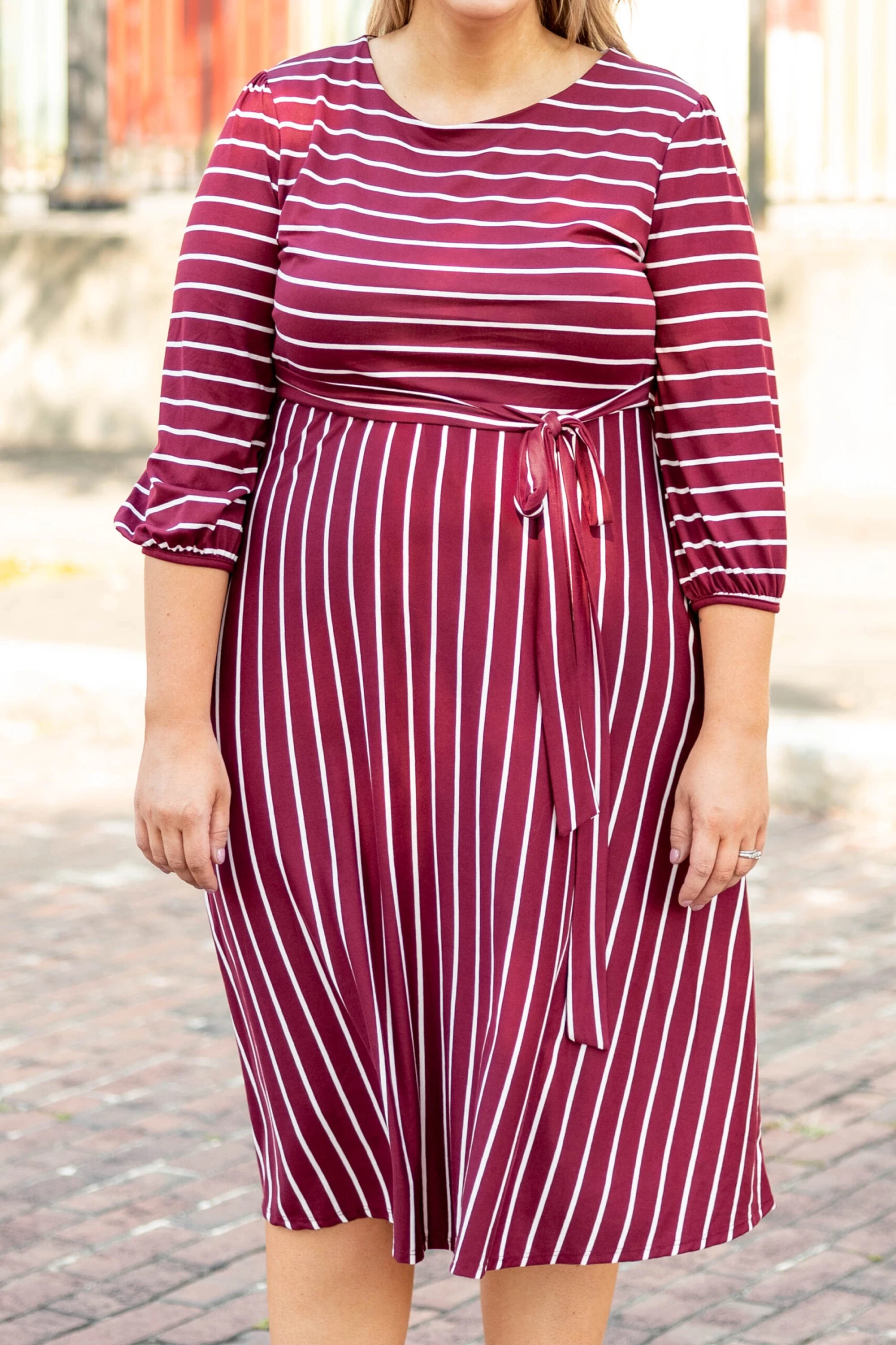 Hold hands with your love when you’re wearing this dress! This dress has the prettiest stripe pattern with a soft wine color you can style for every occasion! It’s comfortable for all-day wear, has a tied waistline to flatter your figure, and even features pockets! Simply, style this dress with heels or wedges for your next date night!Â