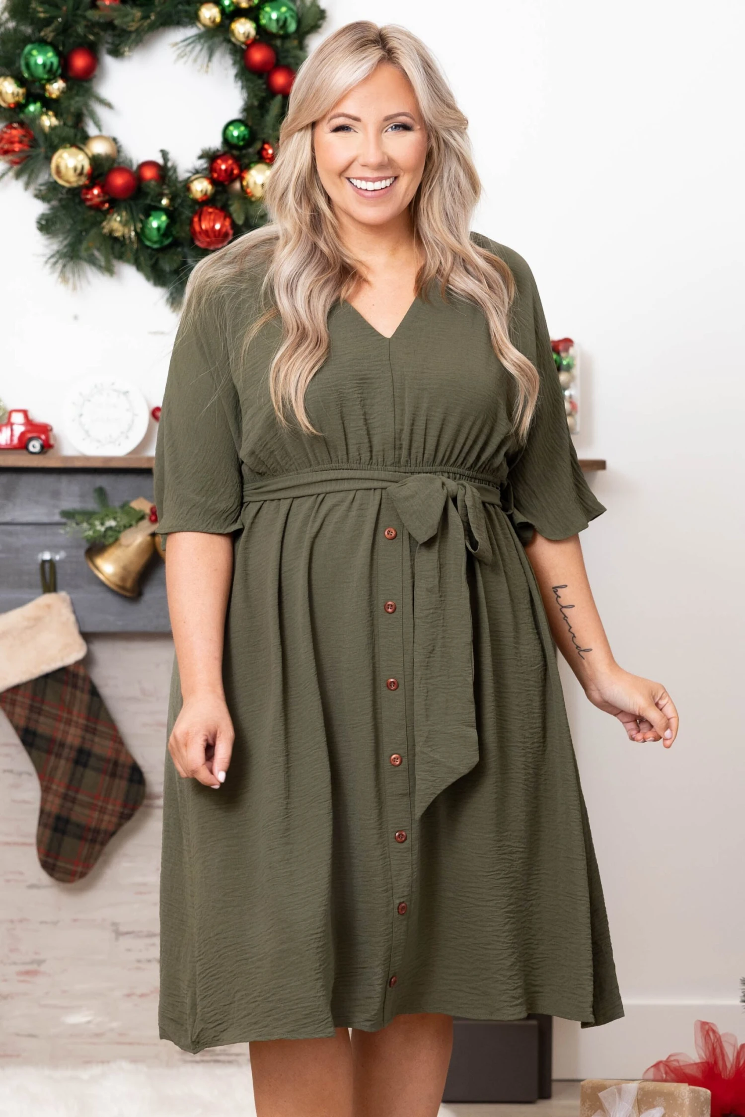 Make this amazing dress all yours! It has a lovely olive color with a flowy, figure flattering fit that is just in time fort he season! The waist tie is super cute and trendy! Throw on this beauty with heels and cute accessories for your next adventure.