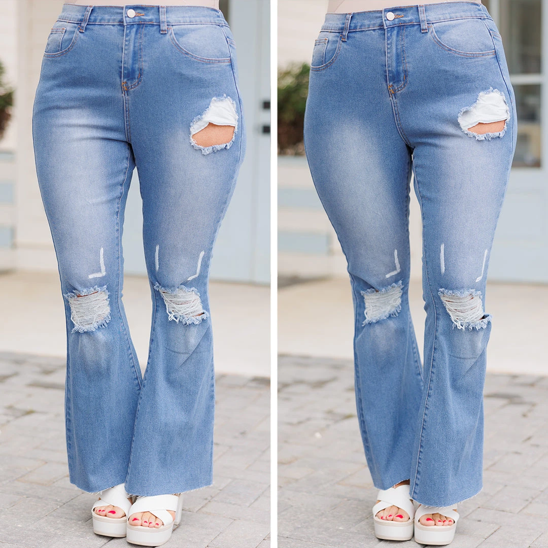 You knee’d these beauties in your wardrobe for the season! These jeans offer a fashionable flare design with a distressed style in a chic light wash color! Perfect for your next outing, these jeans provide a timeless look with the comfort of modern materials!