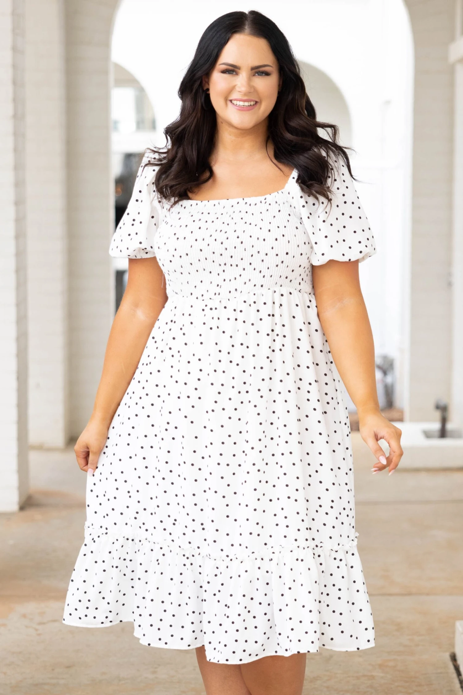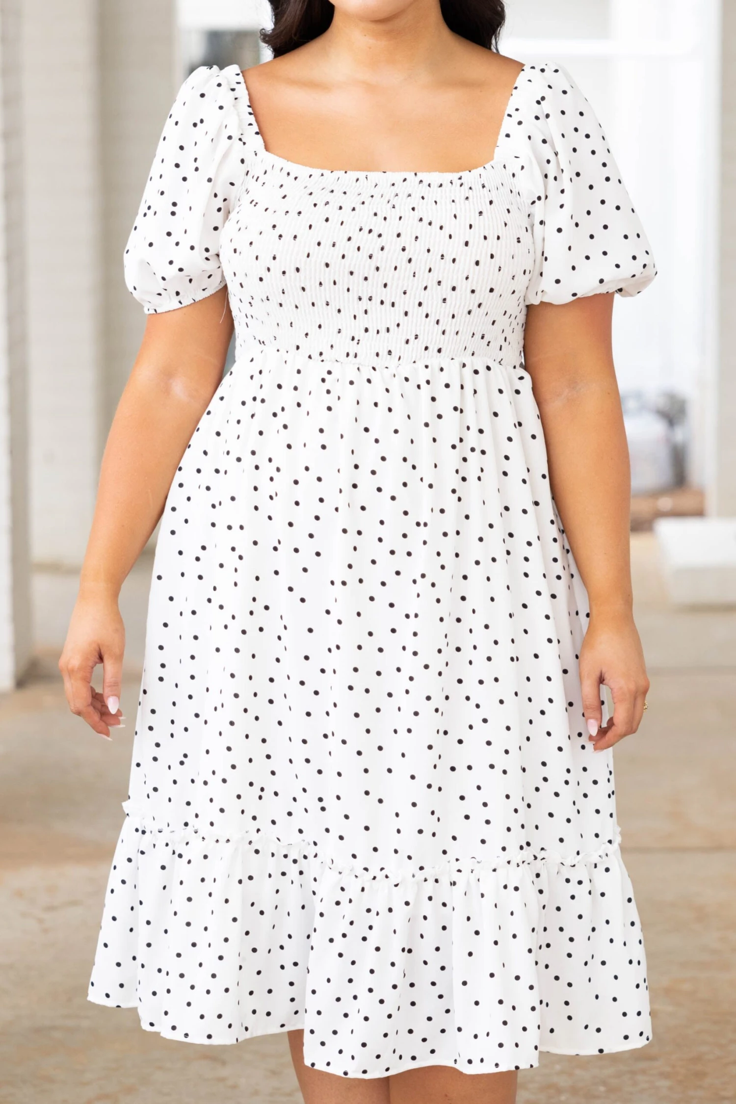 This dress will have you looking like a princess! The white color makes the black polka dot design really pop! The smocked bodice will hold you in in all the right areas and the puff sleeves are so fun! Style this with some sandals for the sweetest look!