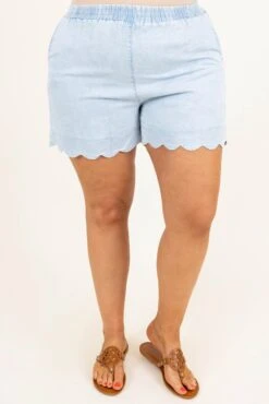 These adorable shorts will be on repeat in your closet this season! The light wash color is so perfect for matching with everything and the scalloped hem is such a sweet addition! We love the elastic waist that is so comfy! Style this with a fun top and some sandals for a super stylish look!