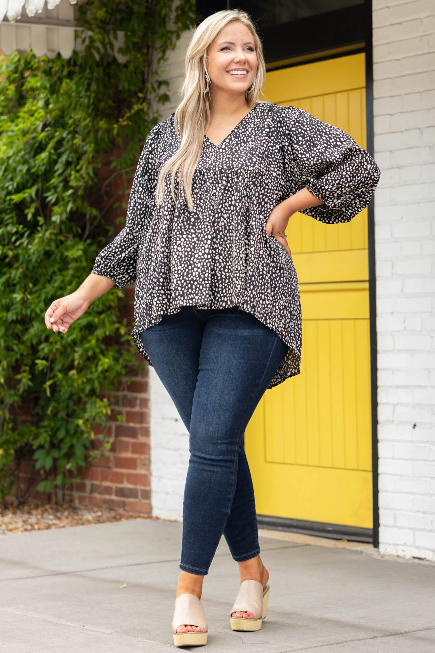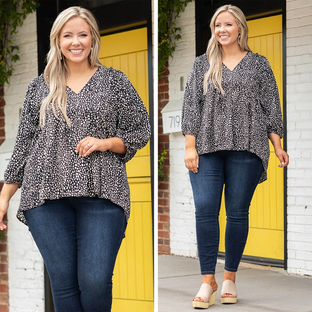 This top is simply breath-taking! This top has a fierce leopard pattern with neutral colors you can style for every occasion! It’s comfortable for all-day wear, has a flowy fit, and features the cutest neckline! Pair this top with skinnies and wedges for an easy, everyday look!Â