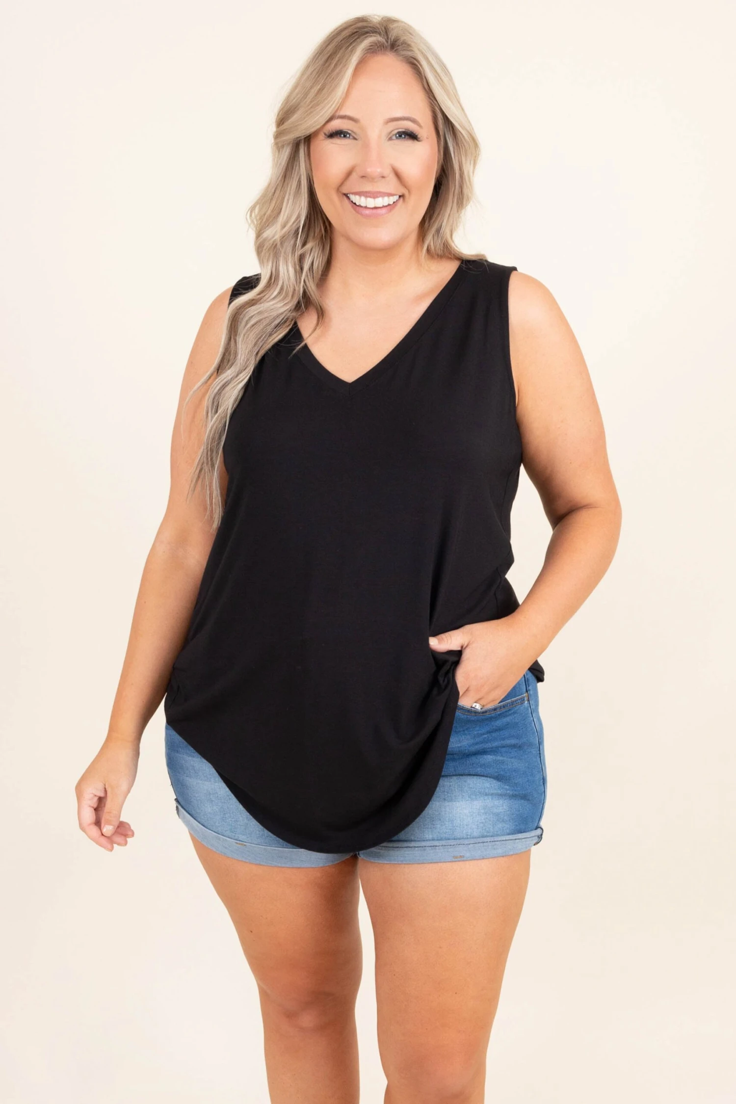 Make your move in this tank! The black color is so perfect to wear with anything and the basic style is perfect for dressing up or down! This cutie is butter soft and has enough stretch to comfortably wear all day! Style it with some shorts and sandals for a comfy yet chic look!
