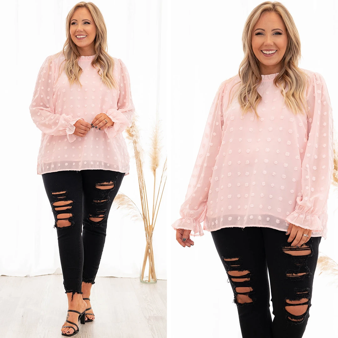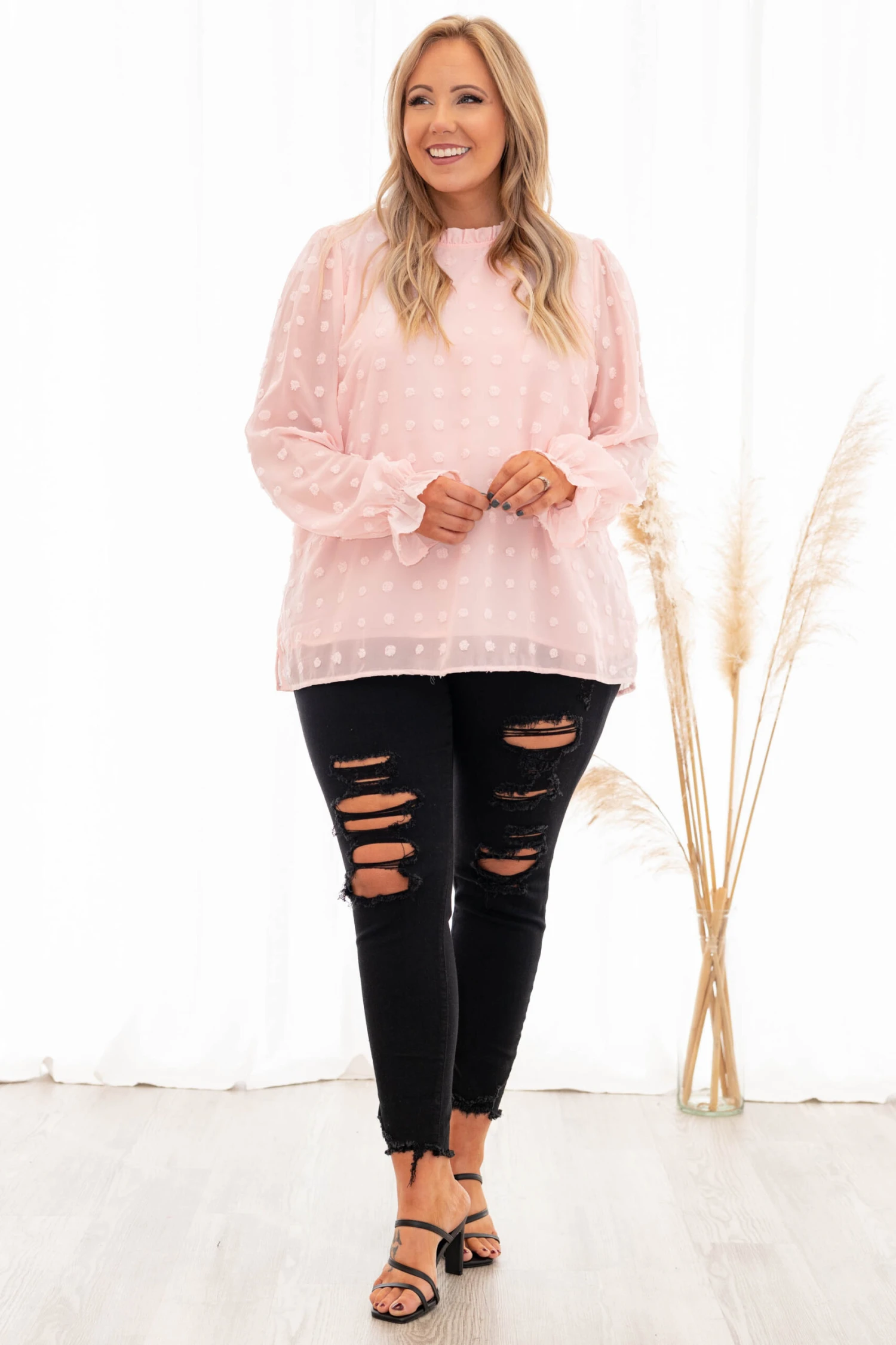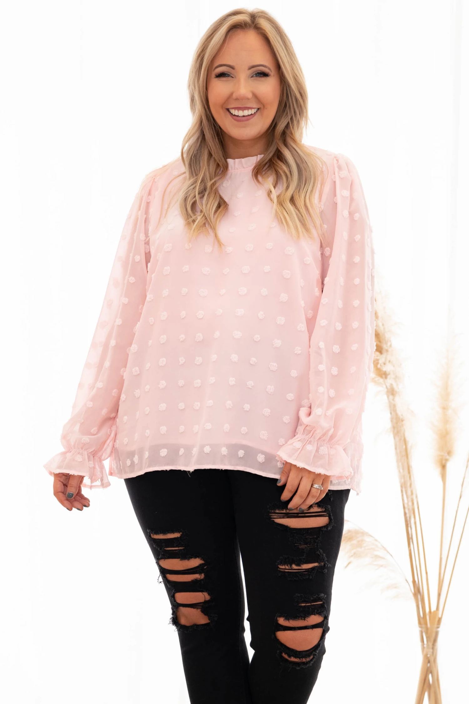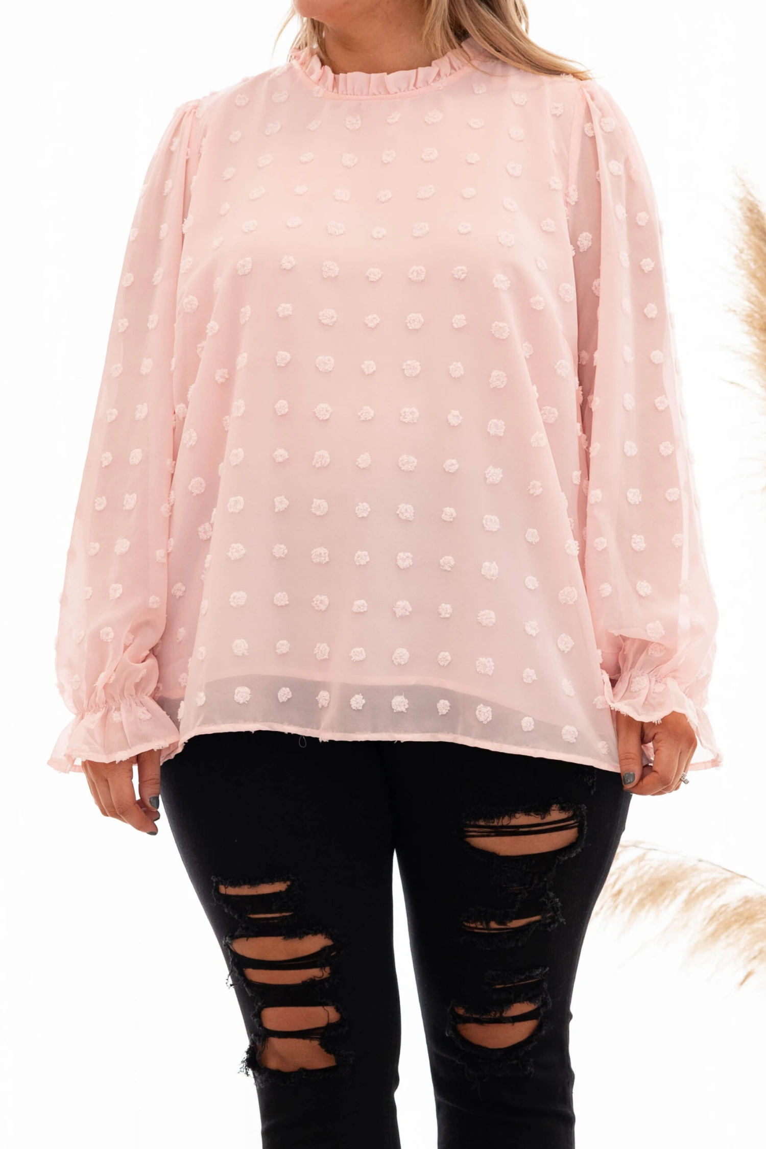 You are minutes away from getting this top! It is the perfect top to throw on for a day at the office or a night out. It features a stunning blush color and fun raised swiss dots. Dress this style up with a fun skirt, or wear it more casually with your fave pair of jeans!