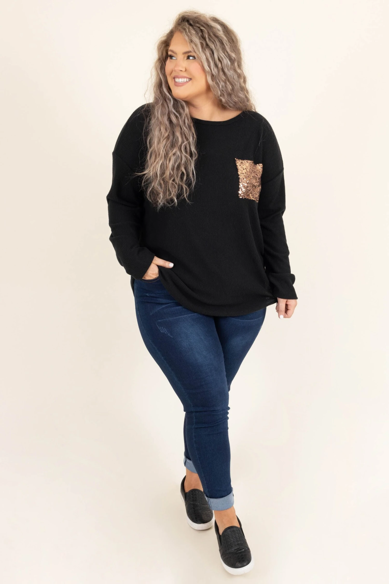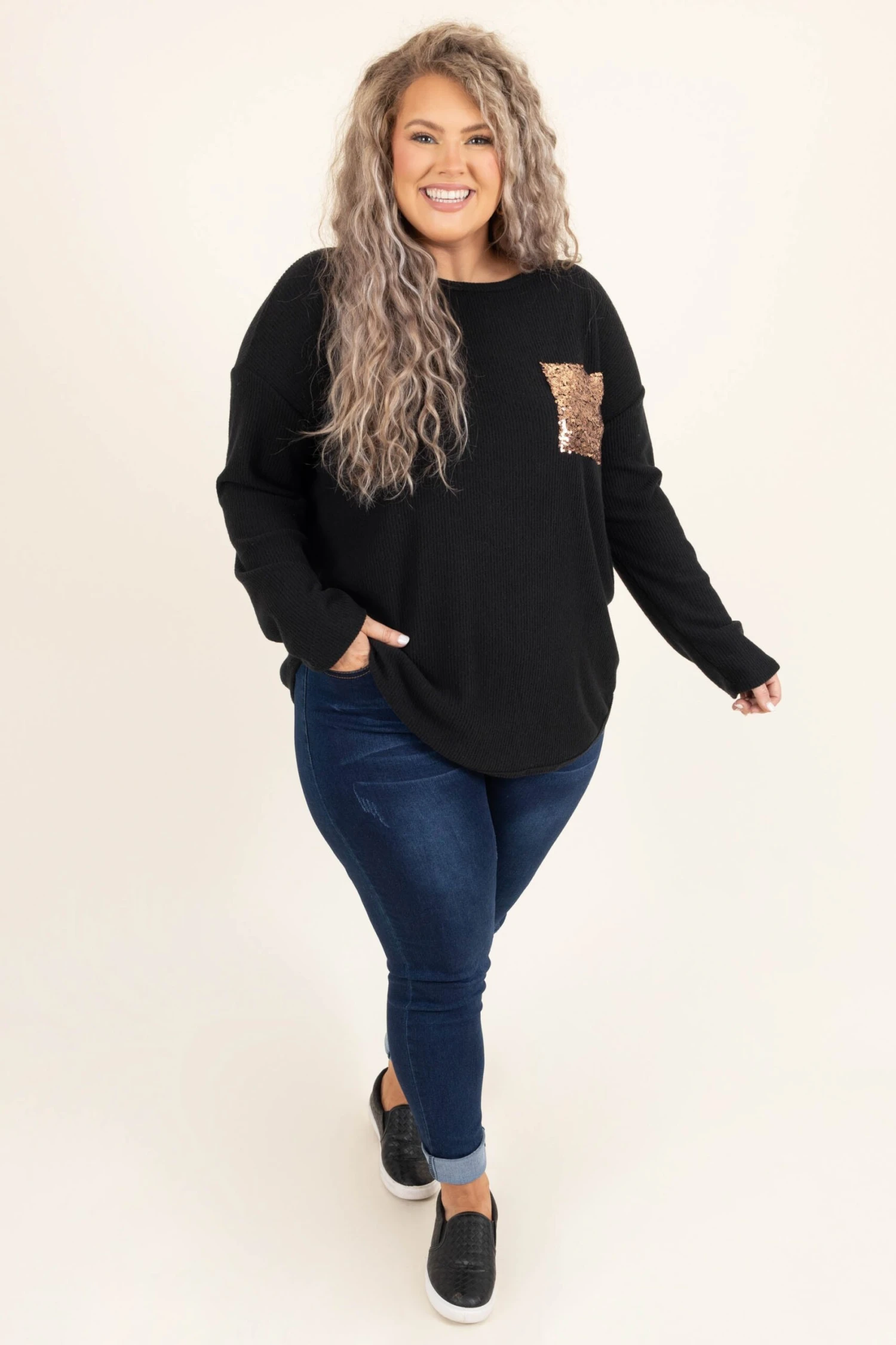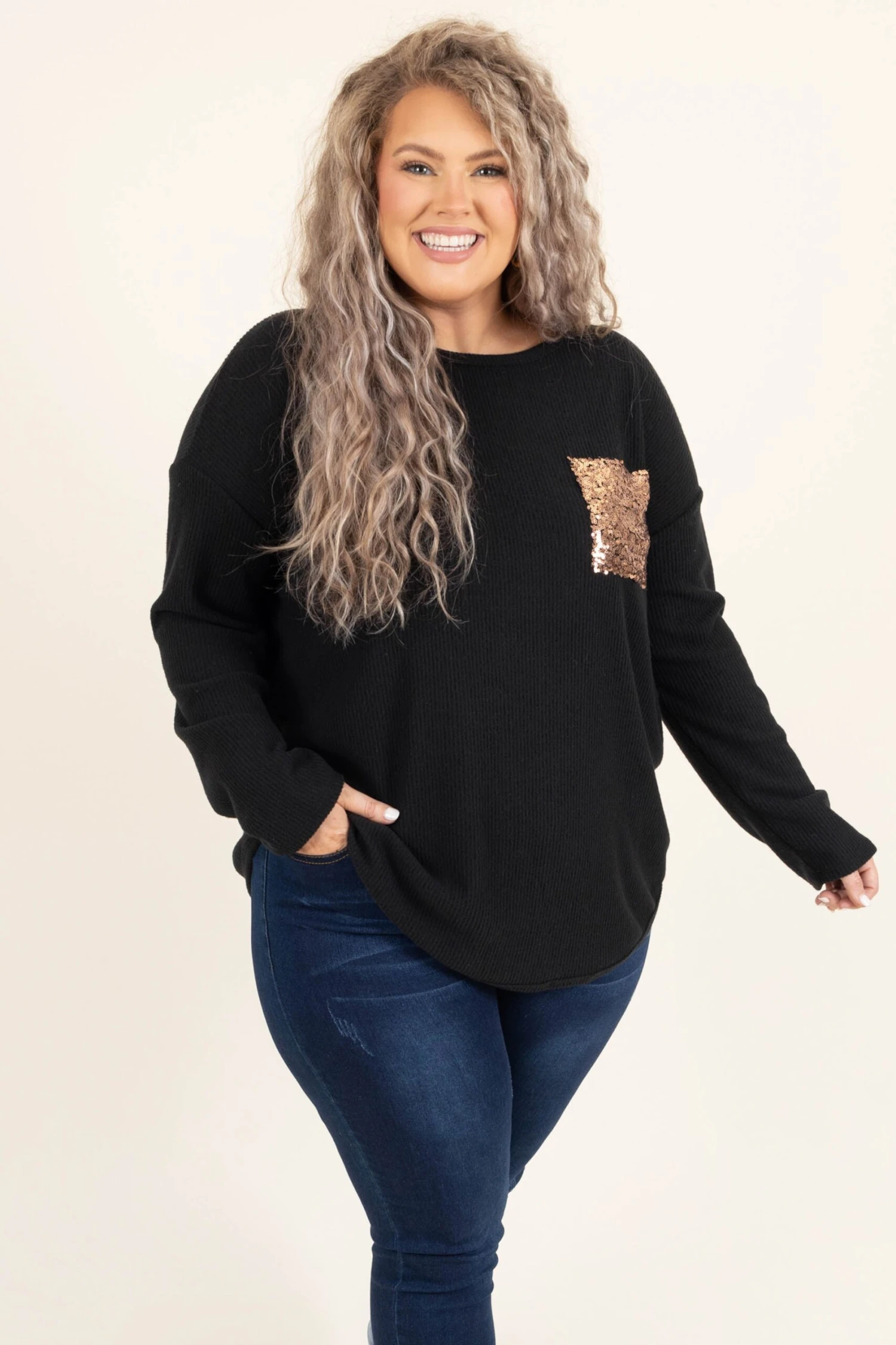 It’s no mystery how gorgeous this top is! The lovely black color, ribbed texture, and chic sequin front pocket is the perfect combo for the season! Style this top with some skinnies and slides for a cute, casual look!Â