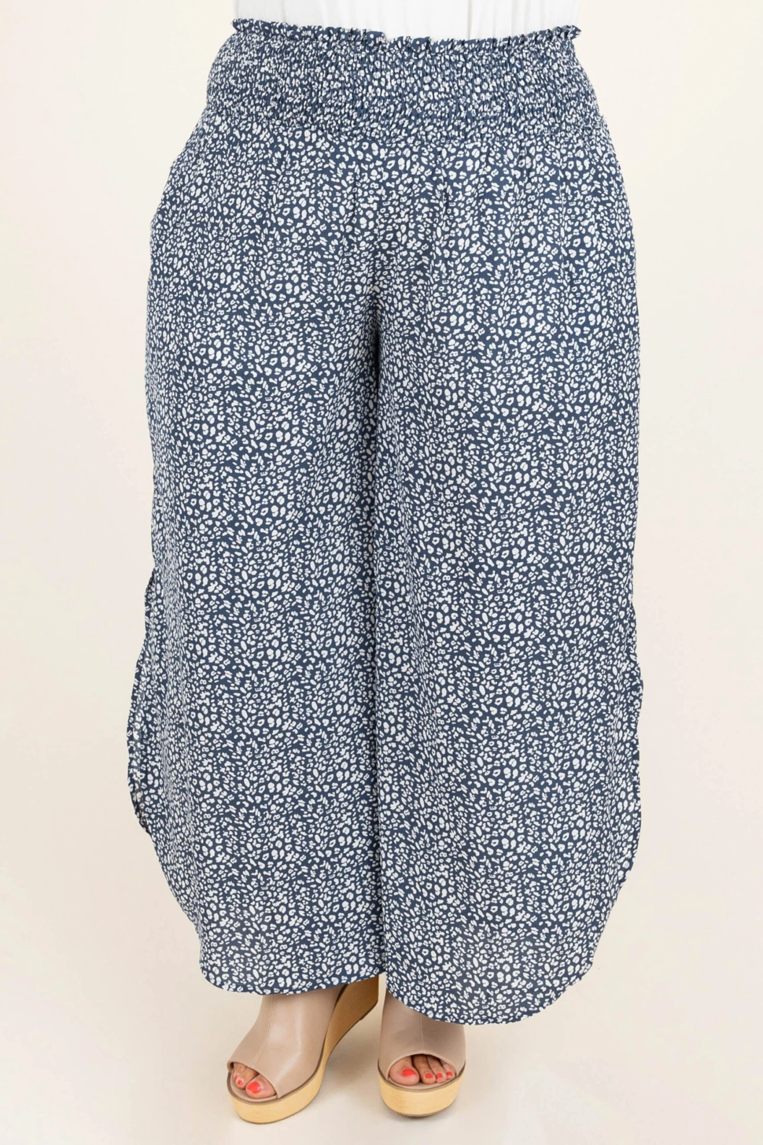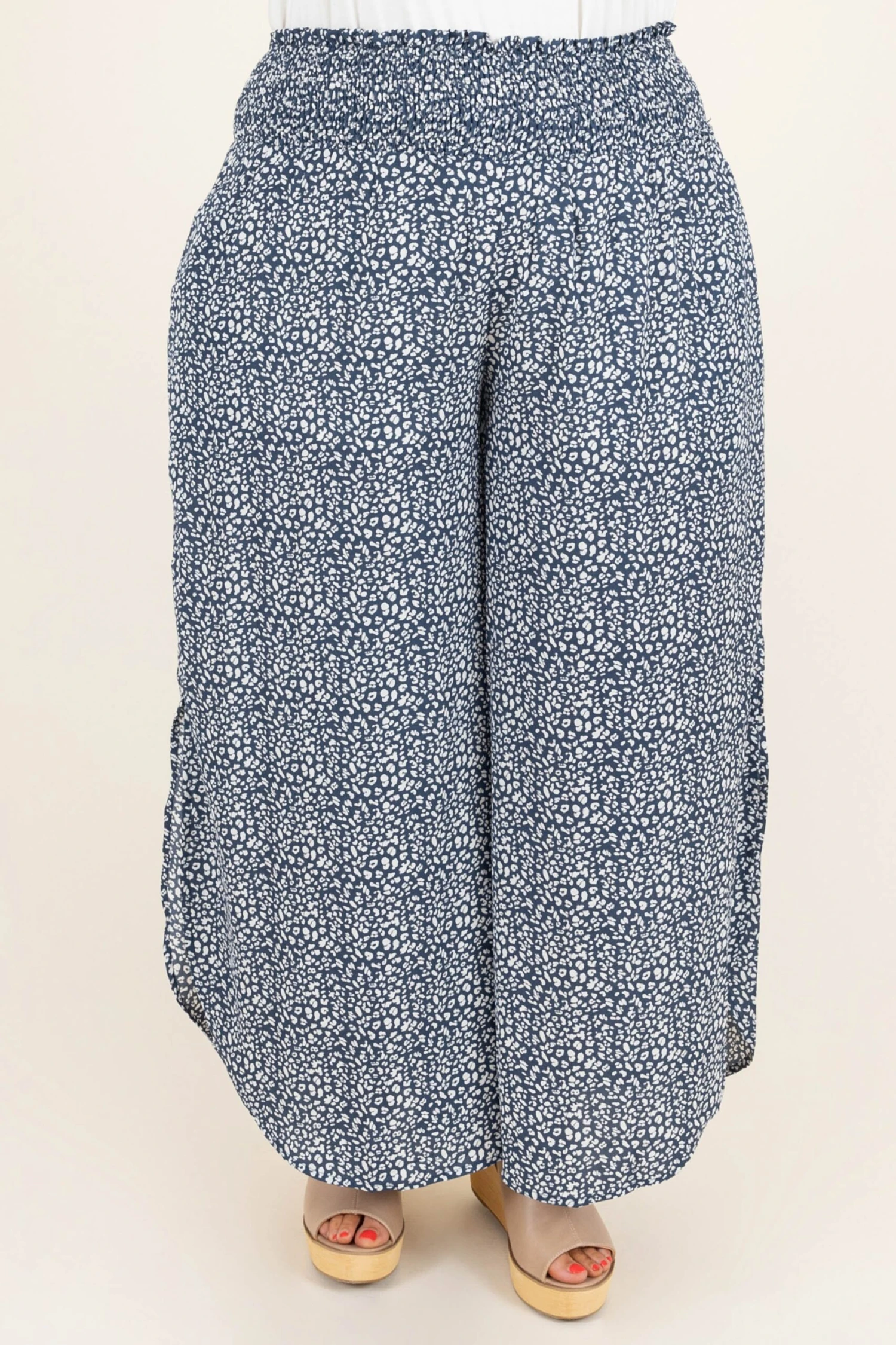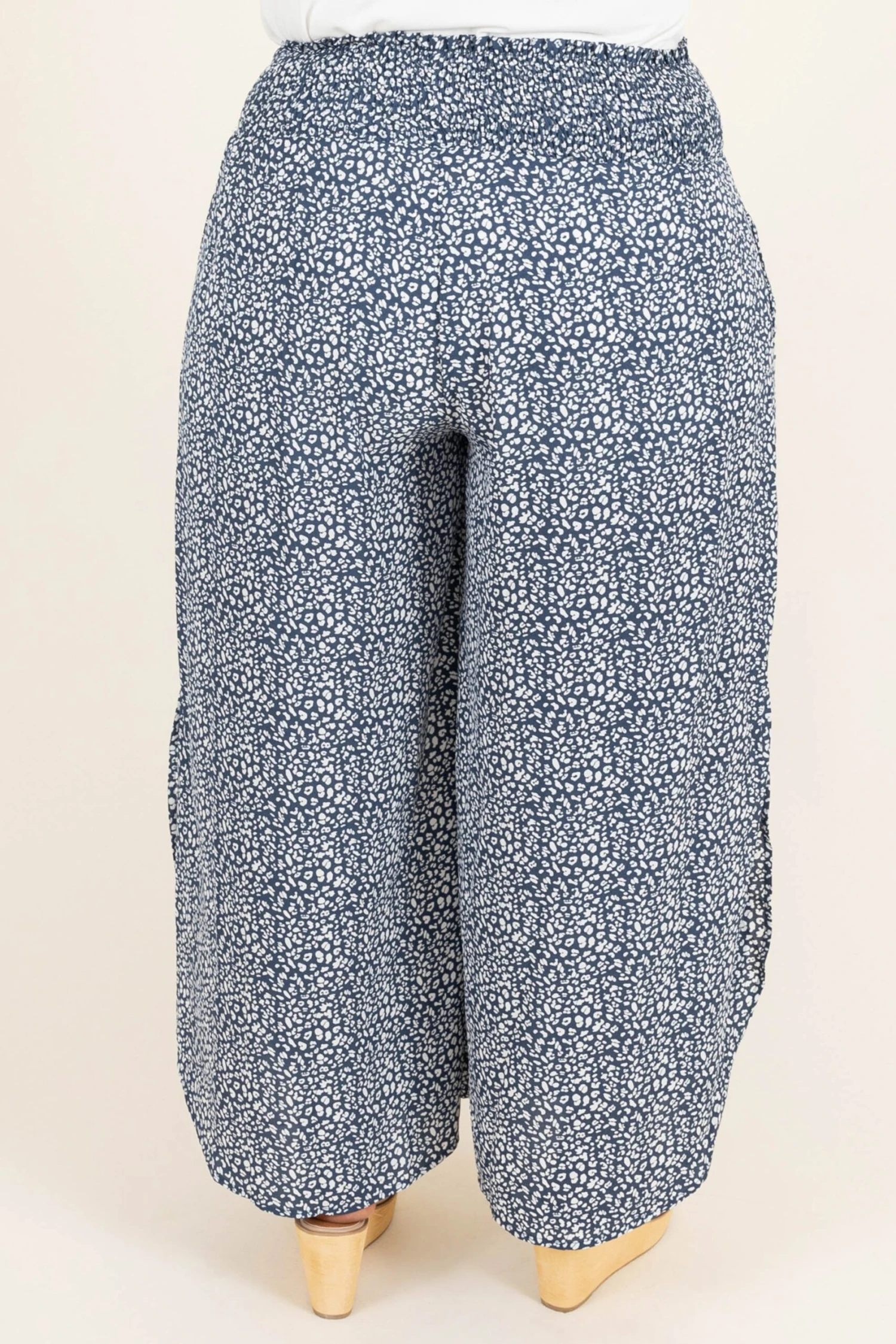 Chill out on the patio in these adorable pants! These pants have a lovely blue color, and a chic leopard pattern! The feathered side splits and elastic waist will give you the perfect fit! Style these pants with a cute top and denim jacket for a bold, trendy look!