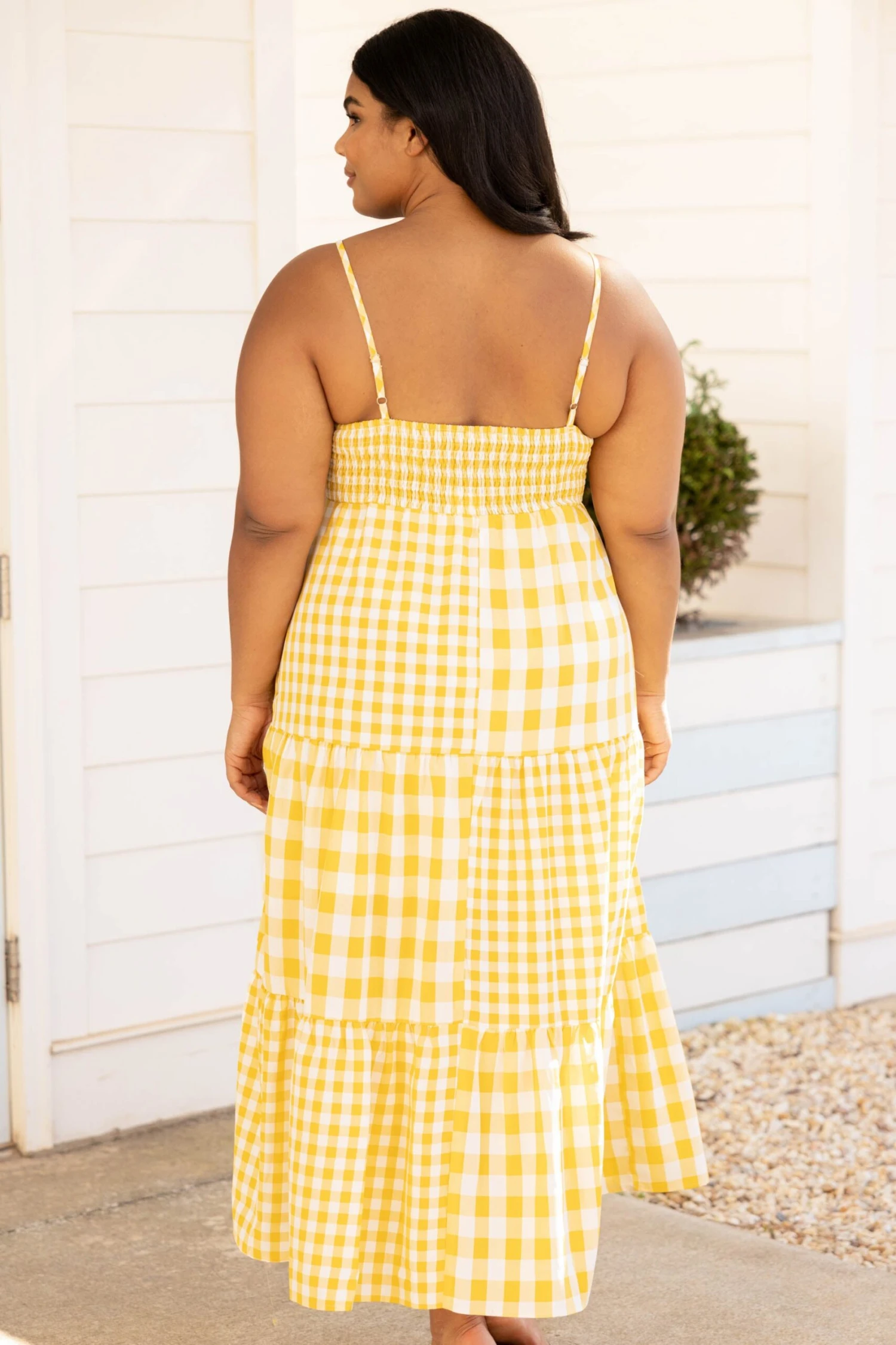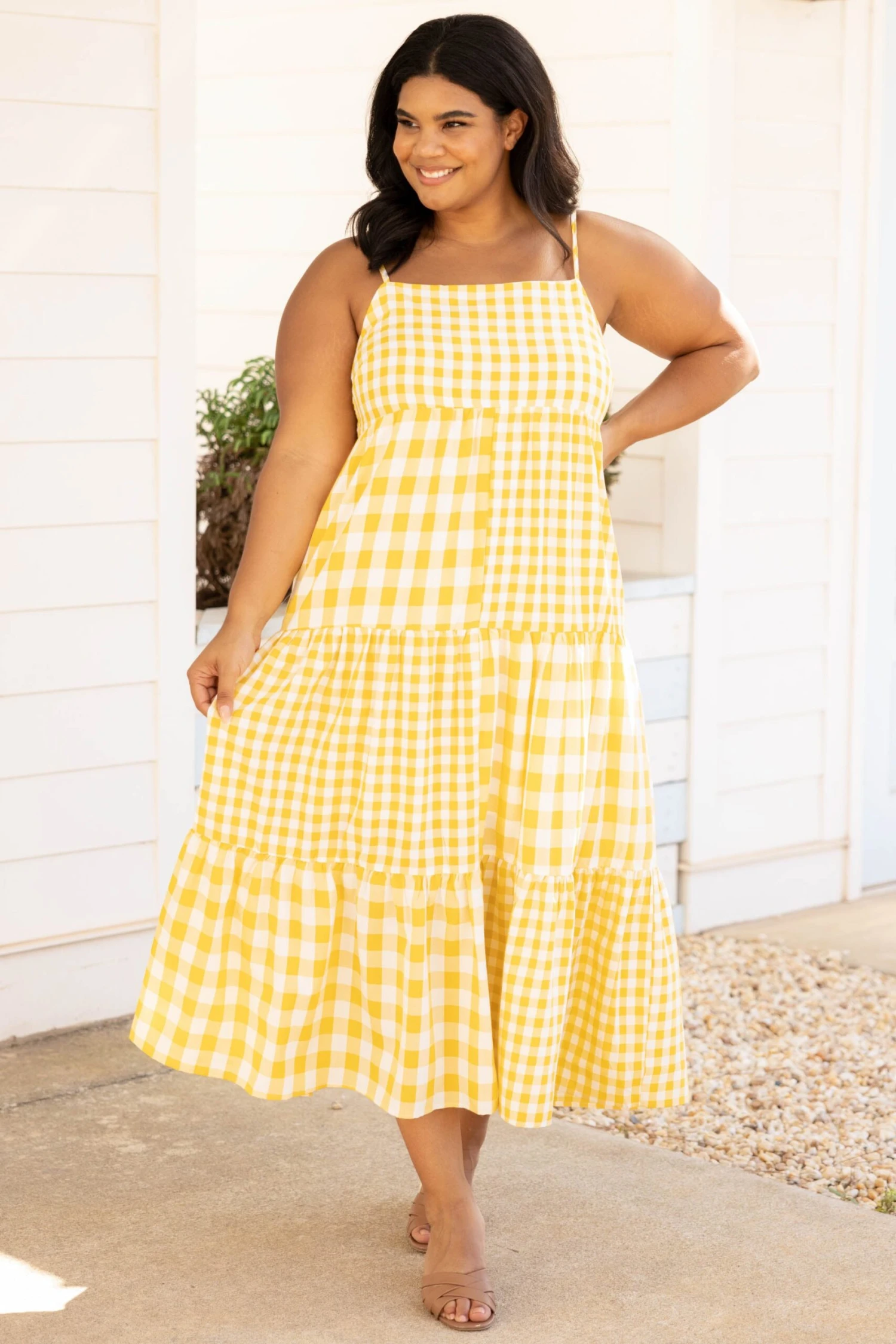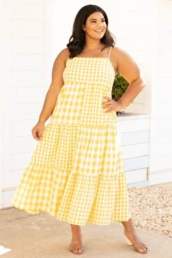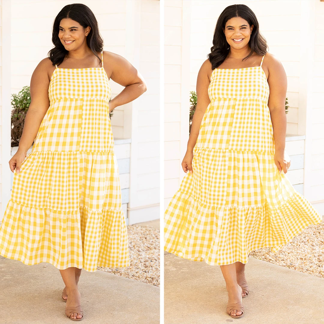 This is the perfect dress for a picnic date on the beach! The yellow gingham blocking is so unique and reminds us of a sunny day! The straps adjust so you can get a tailored fit and the midi length is so in right now! Style this with some heels or wedges for a super sweet look!