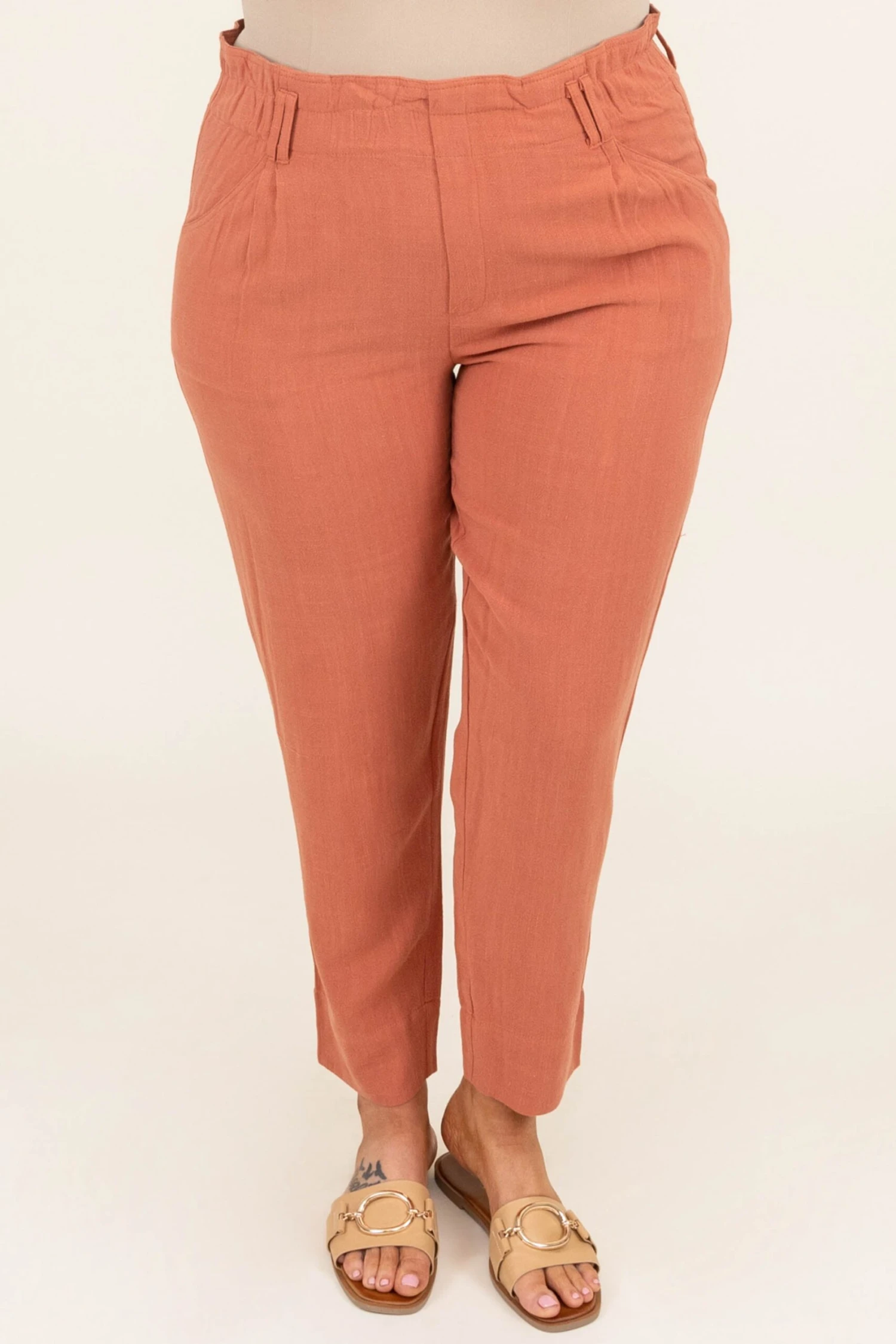Put on these pants and a super cute top and you are ready to go! These have a stunning clay color and a super trendy paper bag waist that is sure to flatter! The elastic waist makes these so comfy for all day wear and the linen material is perfect for spring! Pair them with a solid top and some sandals for a super stylish look!