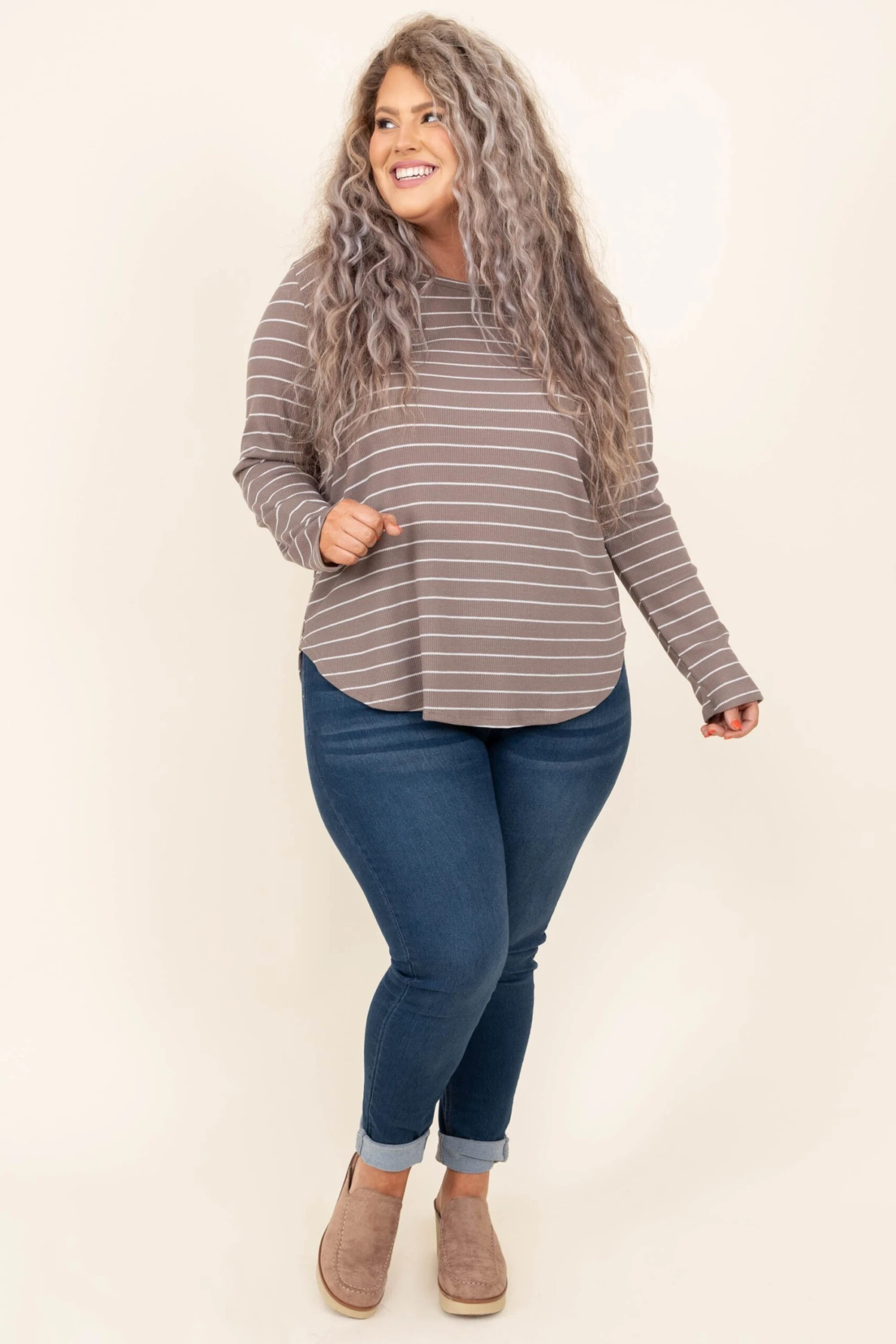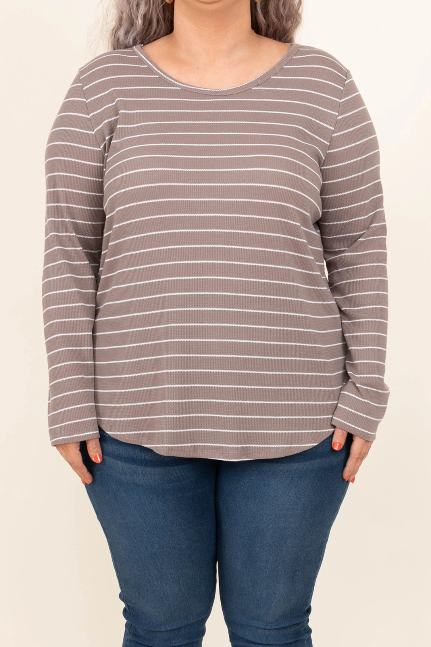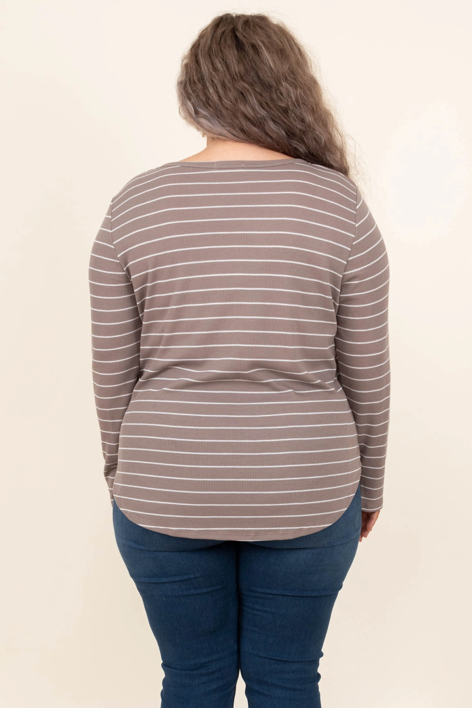 You’ll remember every moment in this cutie! This top has a neutral taupe color with a soft, ribbed texture that is a season favorite! The stretchy., flowy fit is great for pairing with a cute vest and skinnies for a casual chic look!Â
