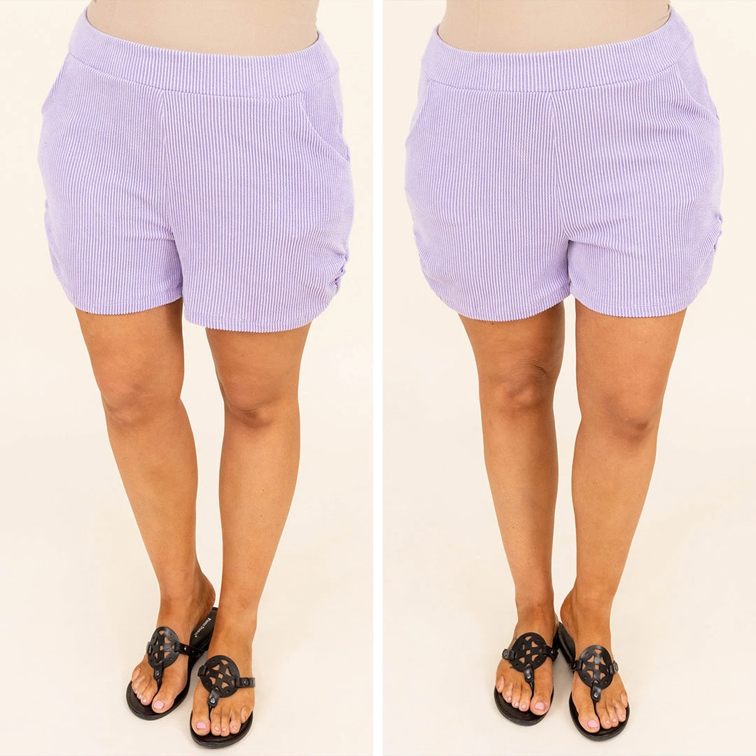 Ride solo in these shorts! The lavender color is so stunning and the ribbed material is super trendy! These shorts are so soft you will want to wear them all day and the slightly cinched sides give these something extra!
