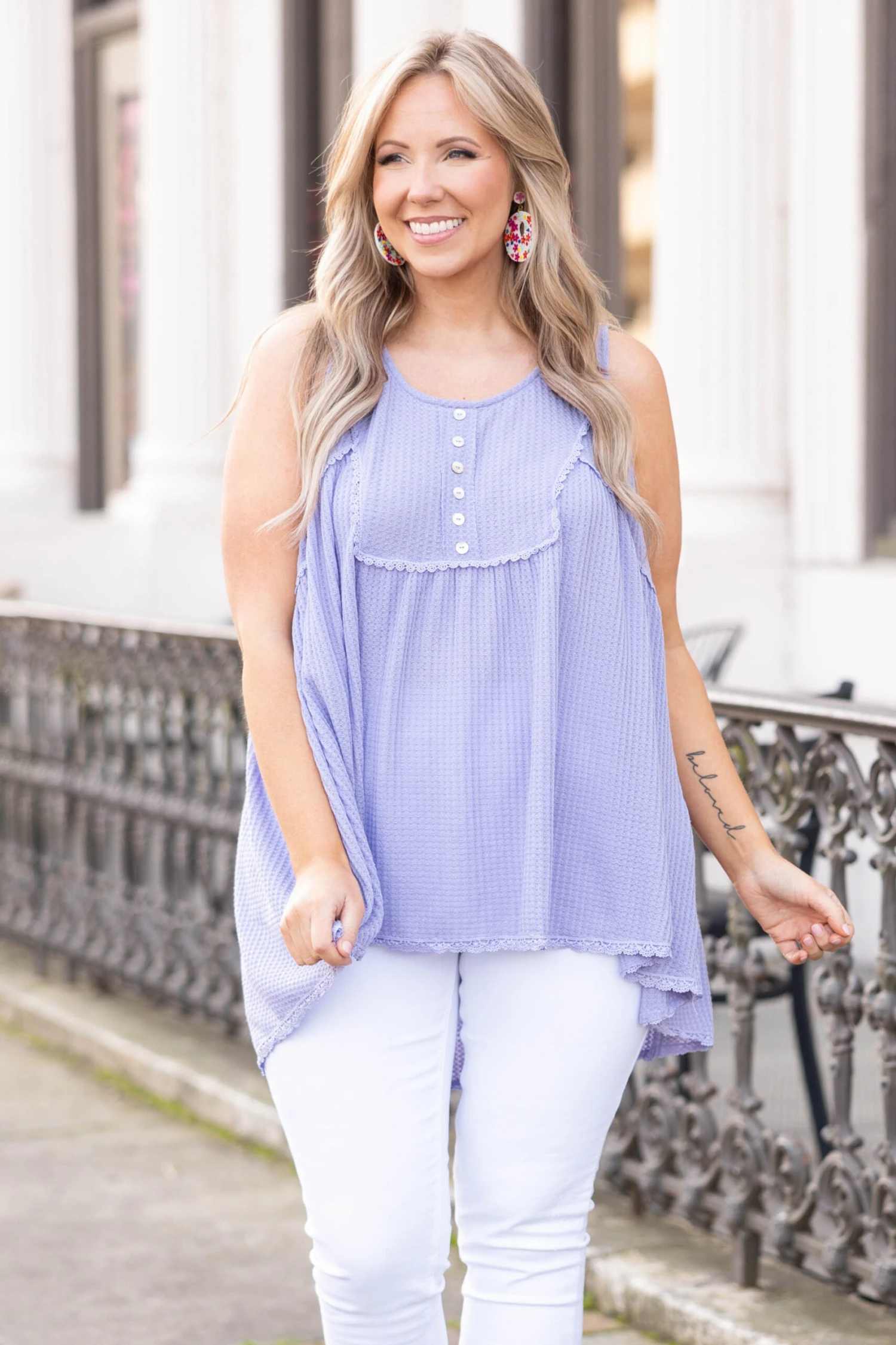 Don’t let this beauty get away from you! This tank has a lovely lavender color with a knitted design that is so soft and comfy! The stretchy, figure flattering fit is great for all day wear throughout the season! Style this tank with some white denim and sandals for a classic chic look!