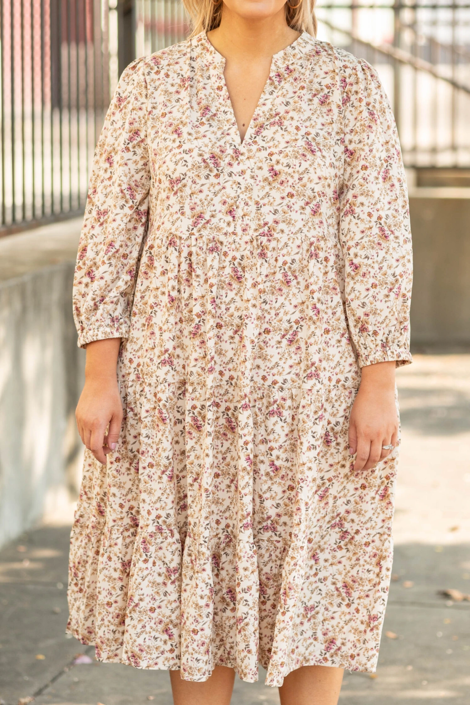 Sweet like sugar! This dress has a beautiful floral pattern for Fall with a chic vintage cream color that can’t be beaten! The neckline is too cute and the fit is sure to flatter every figure! Wear it with wedges or heels for your next event!Â