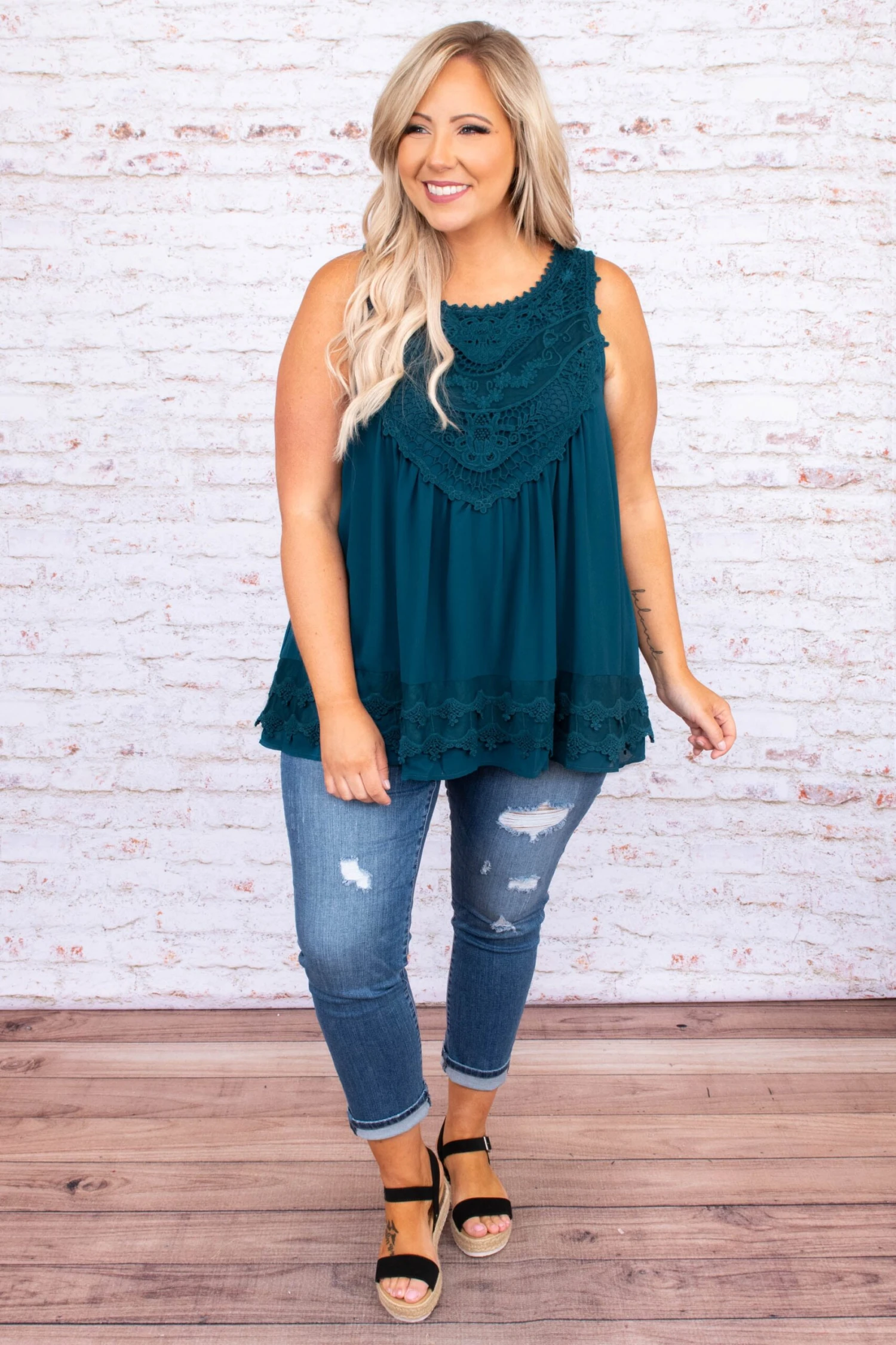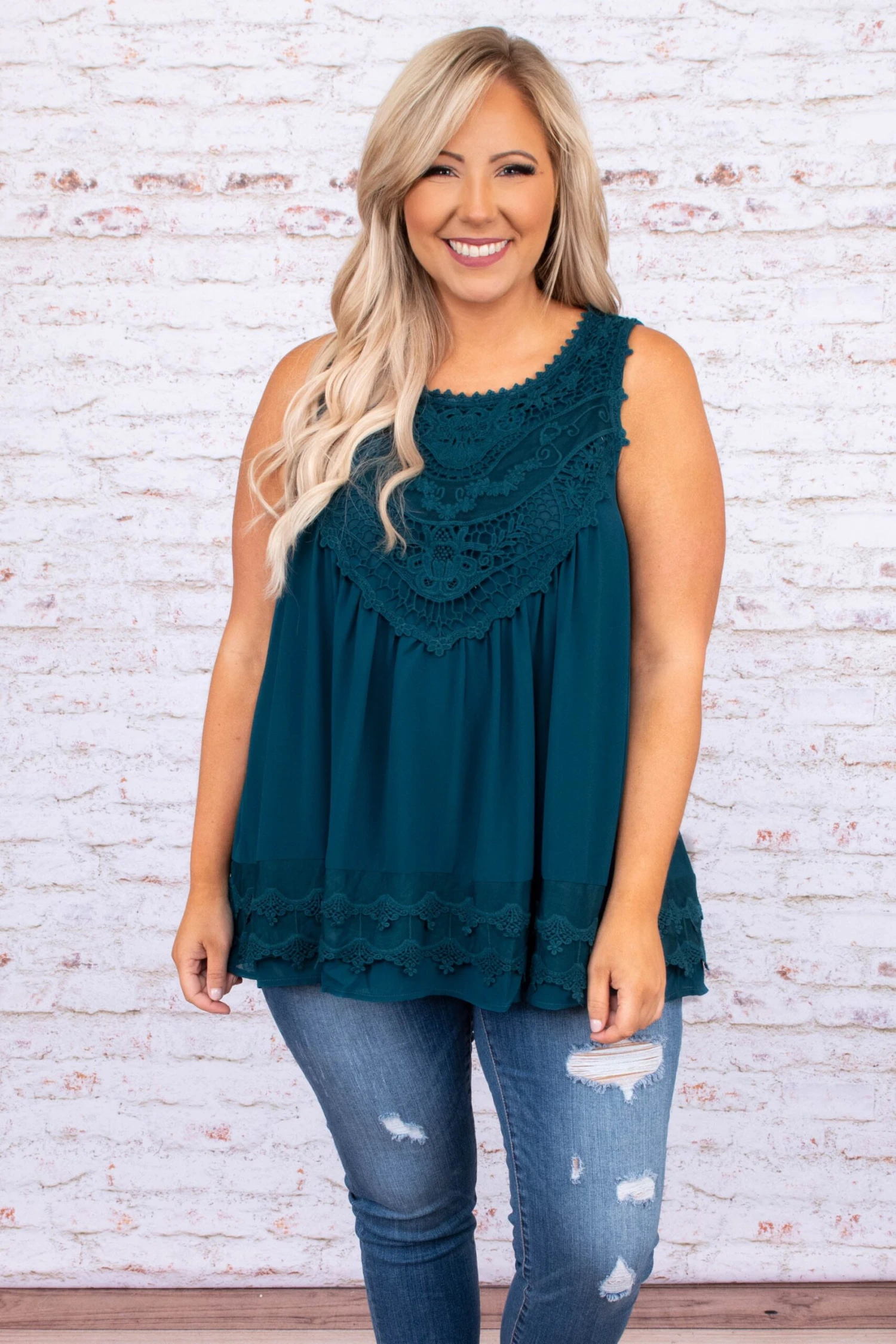 The sweetest, most charming top ever! It has a solid teal color, stunning crochet detailing, and a flowy fit! It’s perfect for Spring and Summer! Pair it with a chic kimono and skinnies for a stylish look!