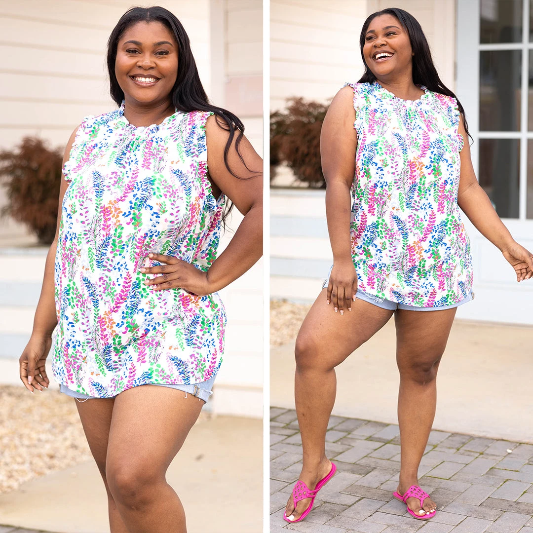 Take this beauty with you on your next adventure! This top has an off white color with a floral pattern that is a season favorite! The ruffled neckline and flowy fit makes this top easy to pair with skinnies or shorts for a classic chic look!