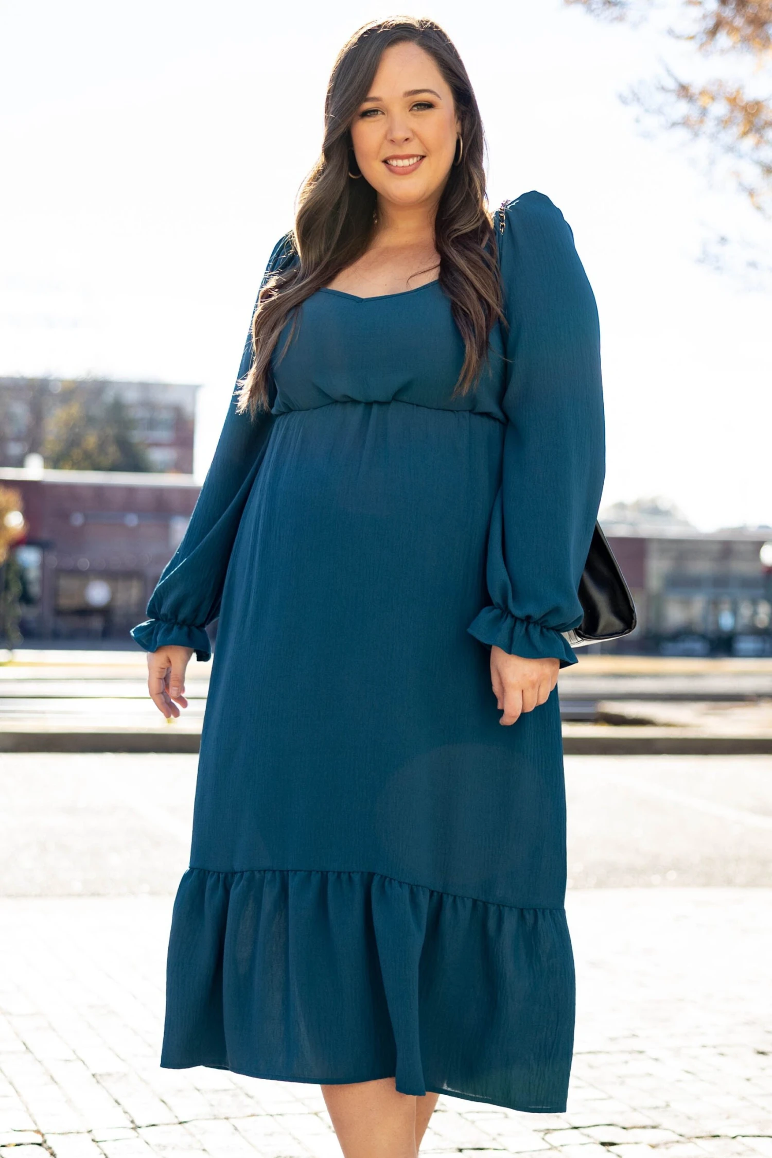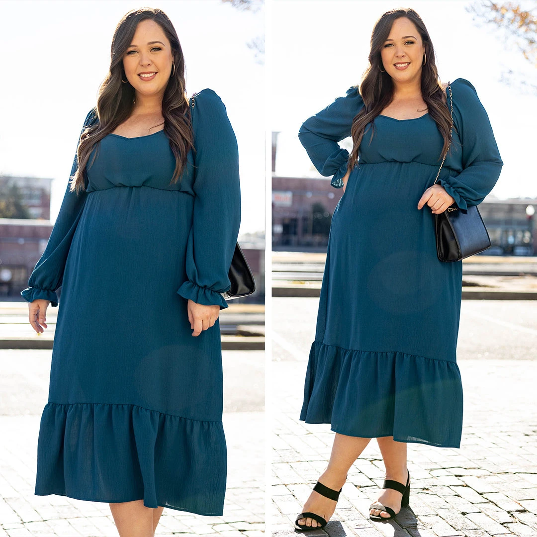Time to show off the new dress! It has a cool teal color you can style for every occasion! It’s comfortable for all-day wear, has a ruffle on the hem, and features long sleeves that are perfect for the season! Pair this dress with booties and your favorite earrings for an effortlessly chic look!
