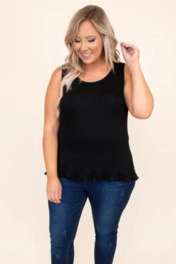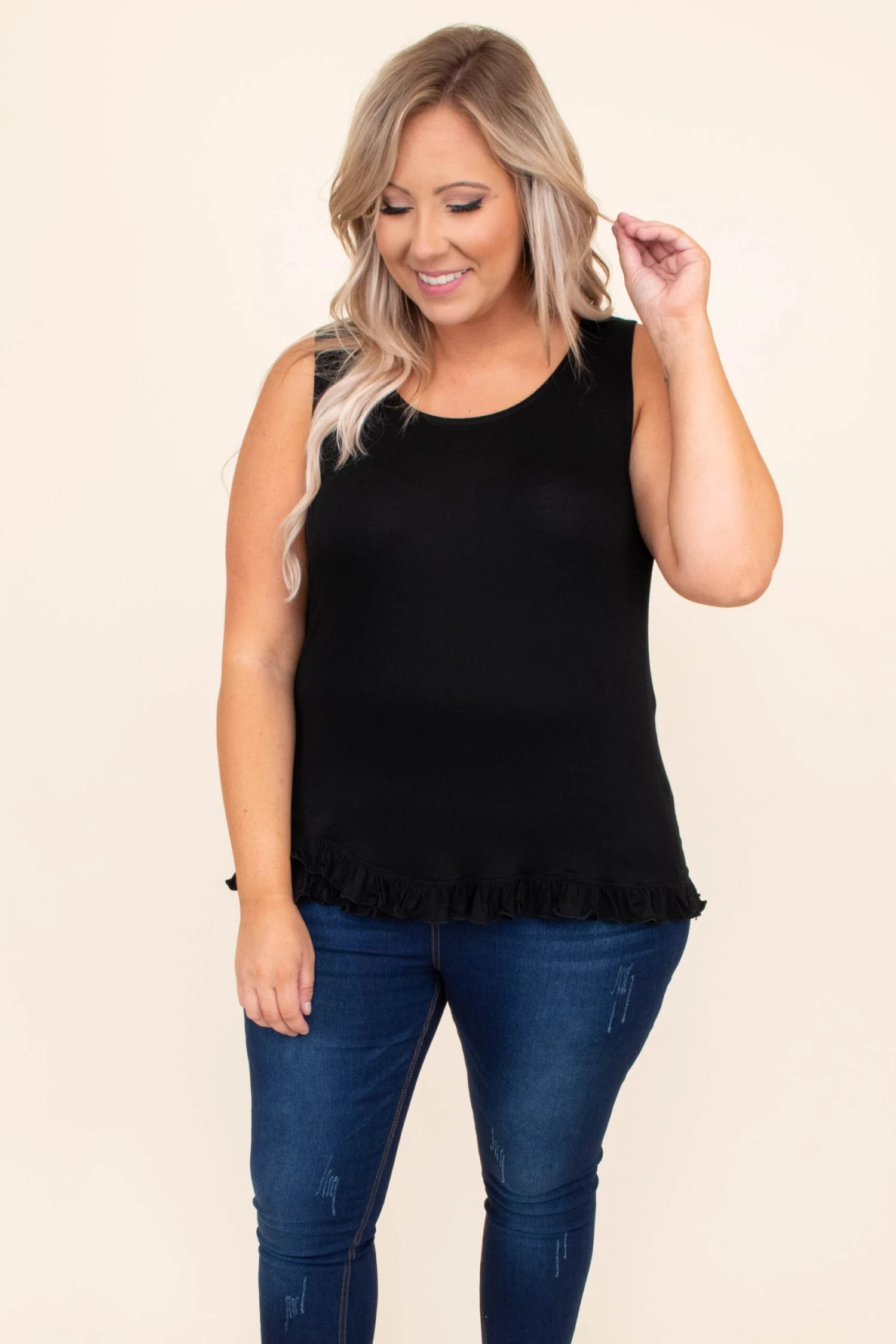 This top is simply timeless! This tank has a solid neutral color you can dress up or down and style for every occasion! It’s comfortable for all day wear, has a figure-flattering fit, and features the cutest ruffled hemline! Style this tank with skinnies or shorts for an effortlessly chic look!Â