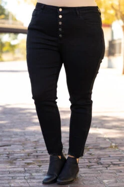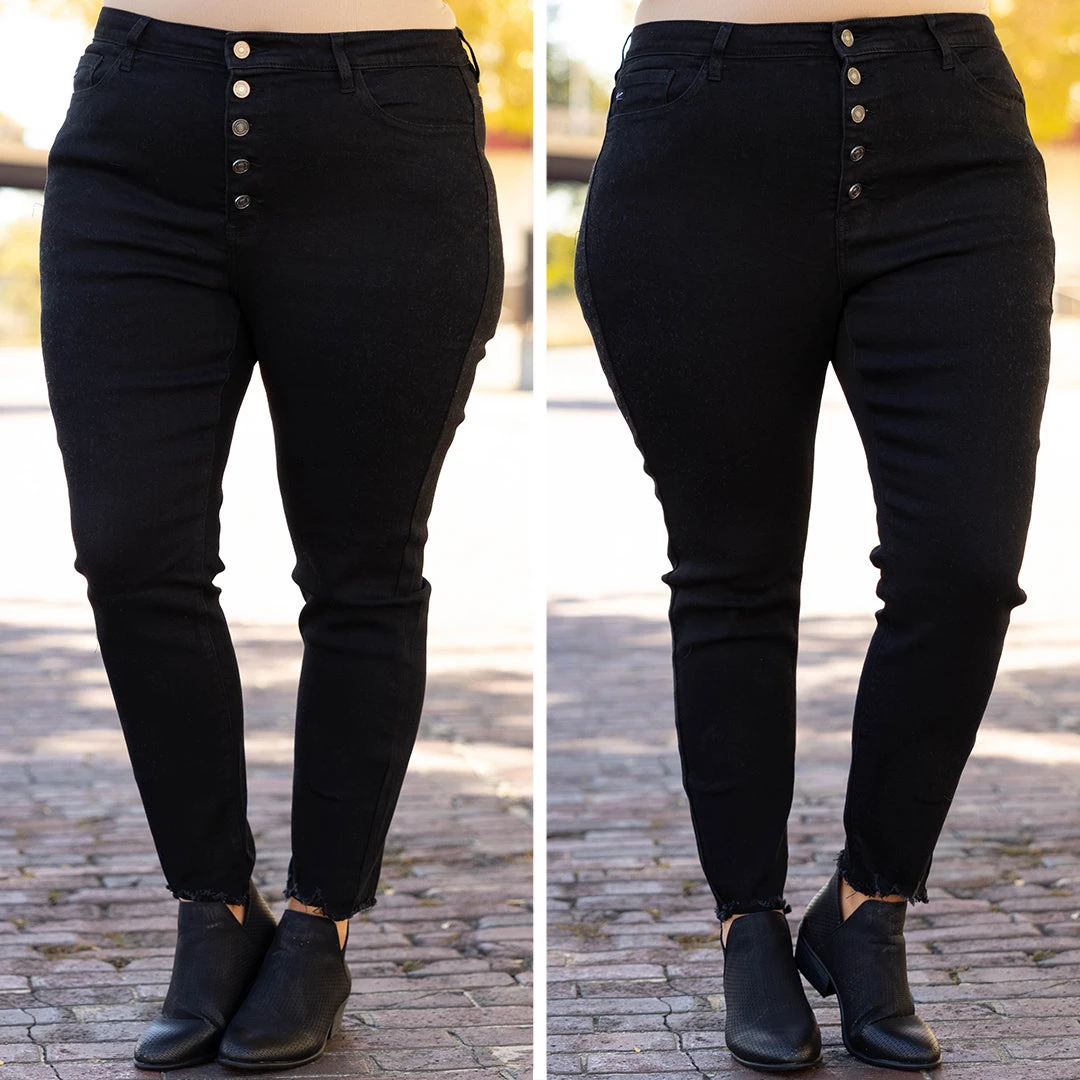 Everyone will be looking your way when you wear these jeans! They feature a classic black color with buttons up the front. These skinnies are sure to look great with any color top, tunic, or jacket!