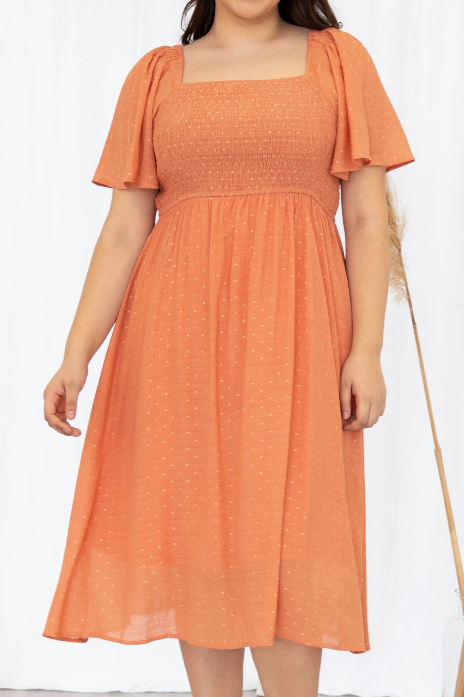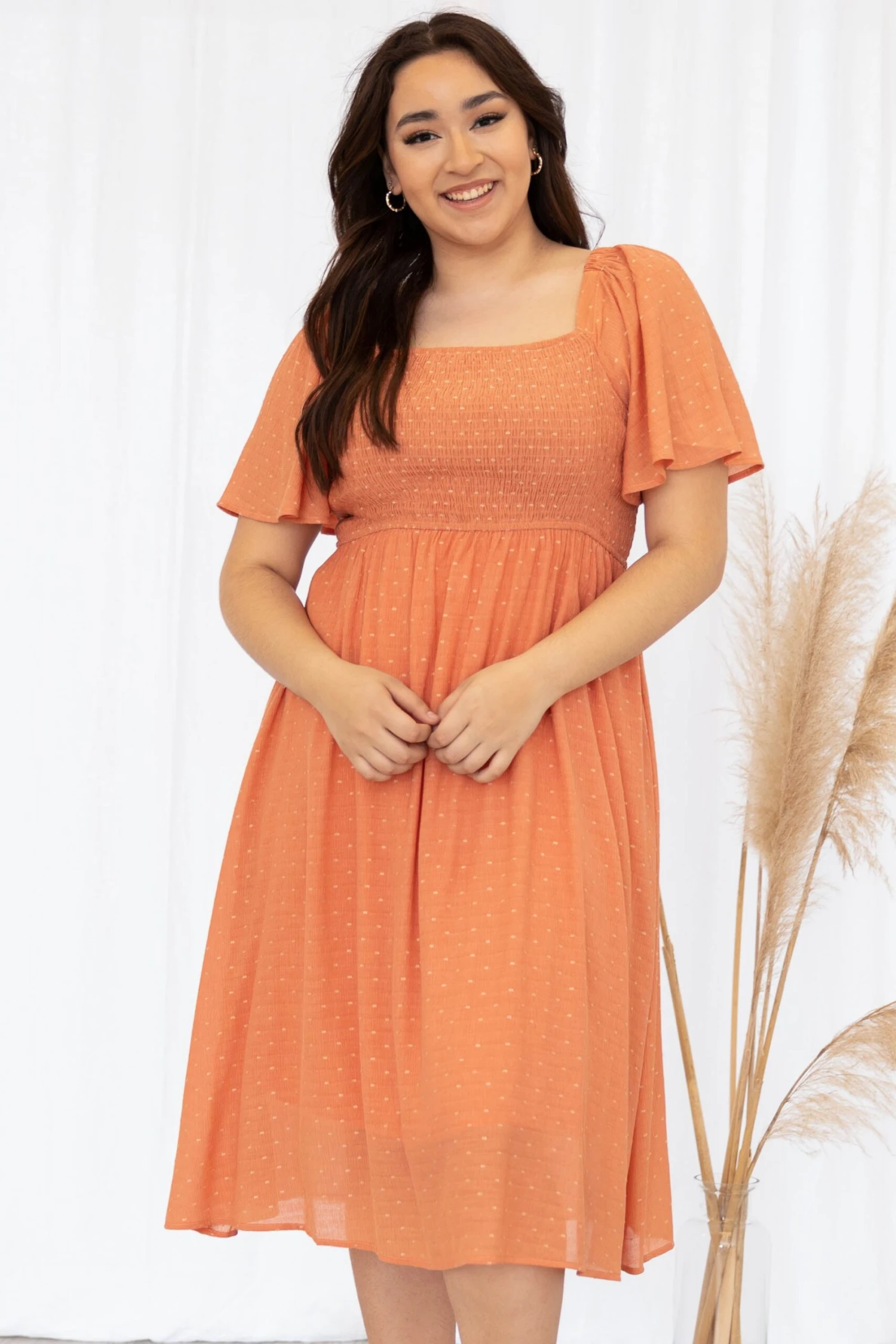 This dress is too sweet for it’s own good! The ginger color is so dreamy and the raised dot pattern is so trendy! This dress has a smocked top for a super flattering look and flutter sleeves that we can’t get over! Pair this dress with some heels and super cute earrings for the perfect event look!