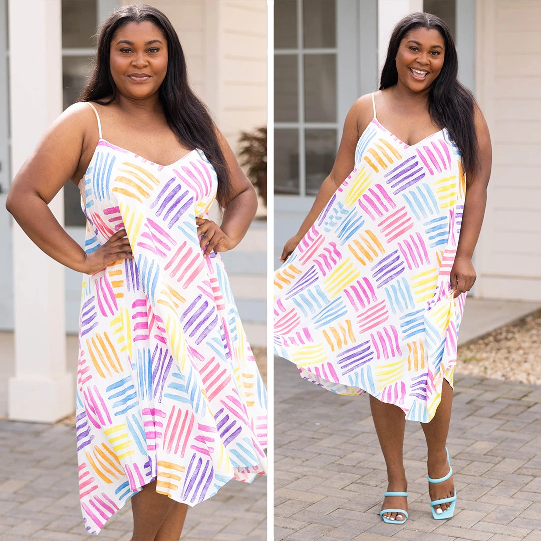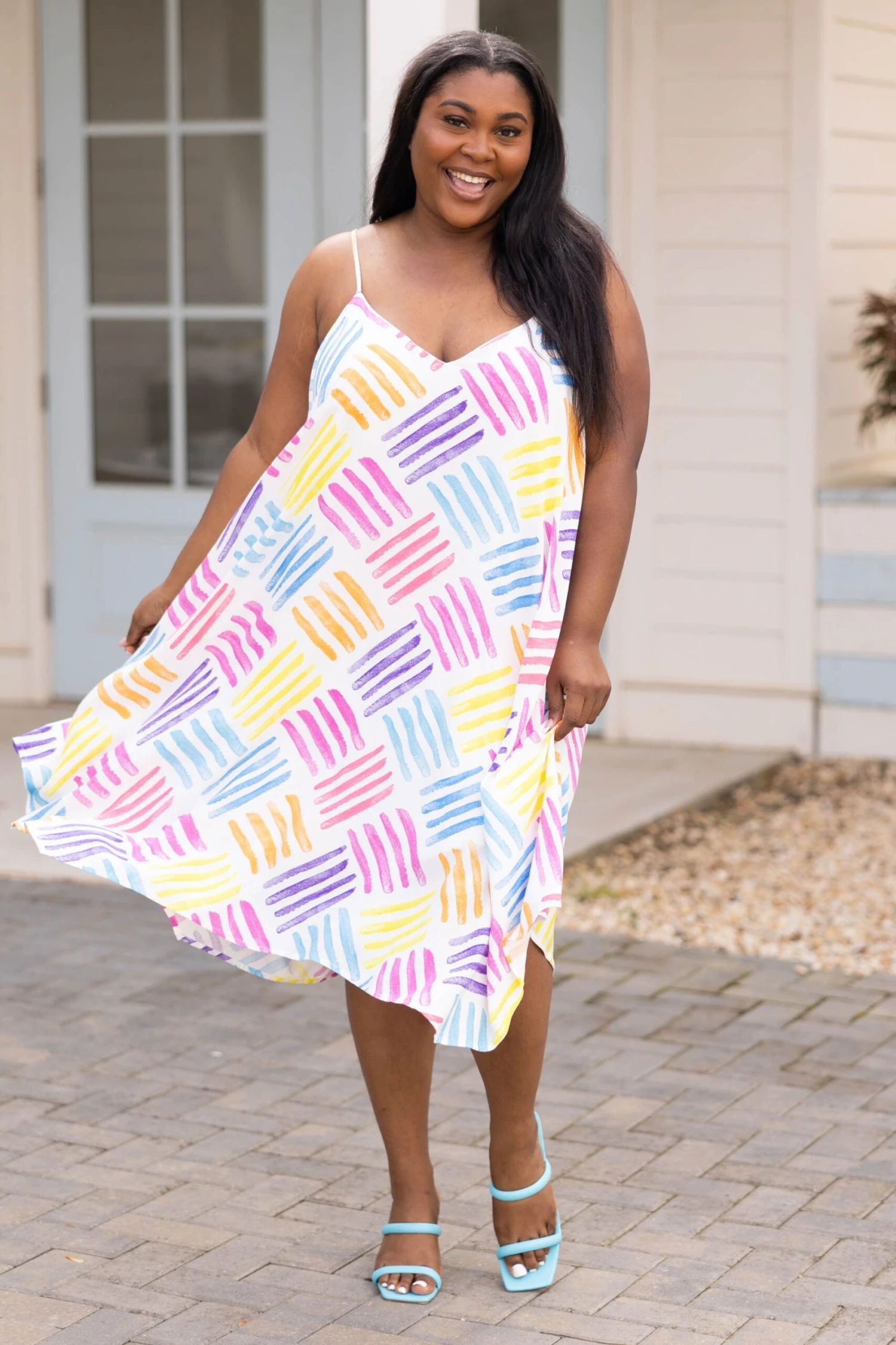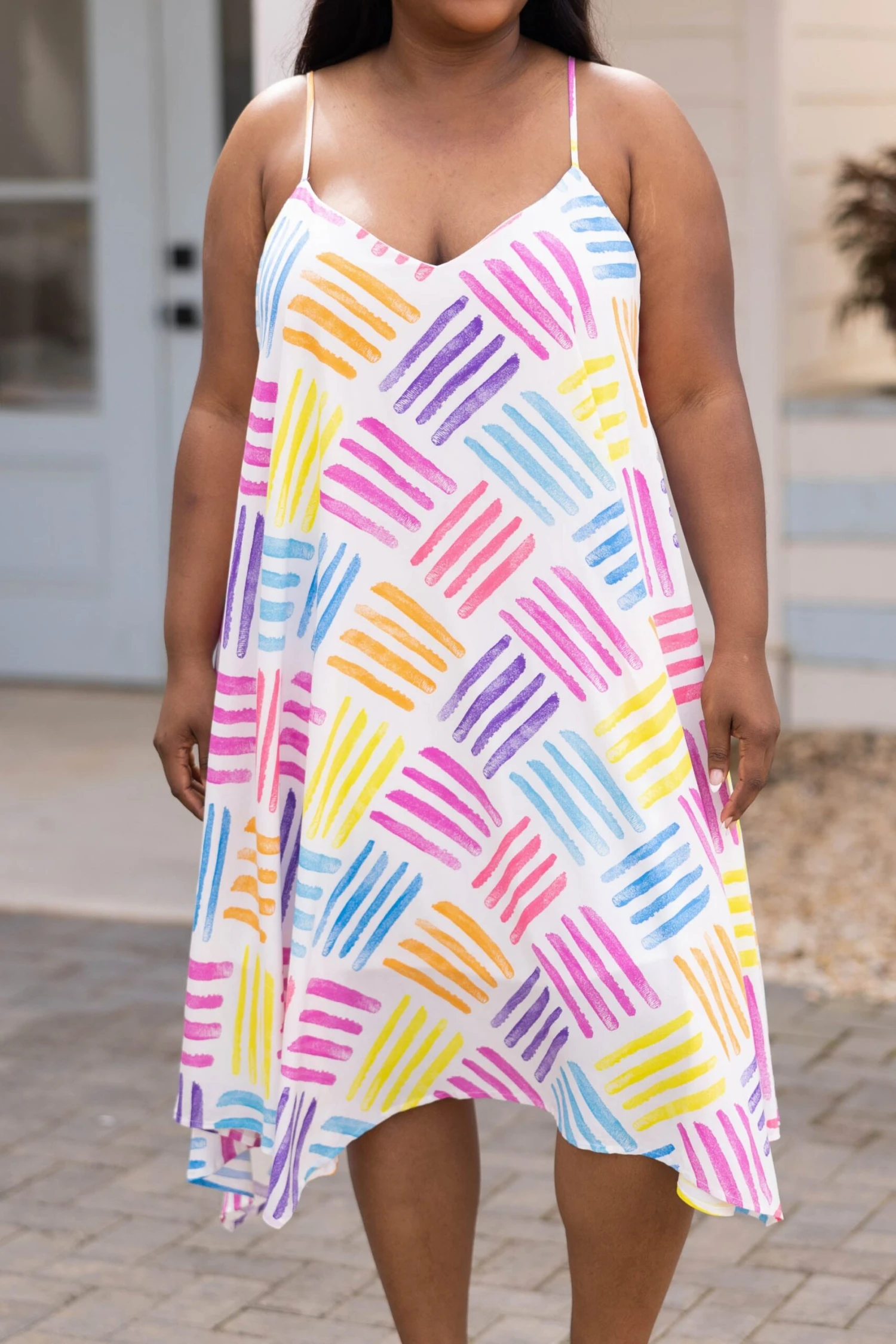 Get out and enjoy the sun in this FAB dress! It features an abstract design and spaghetti straps for a comfortable, flowy fit! Dress up or down, allowing the beautiful design to speak for itself all season long!