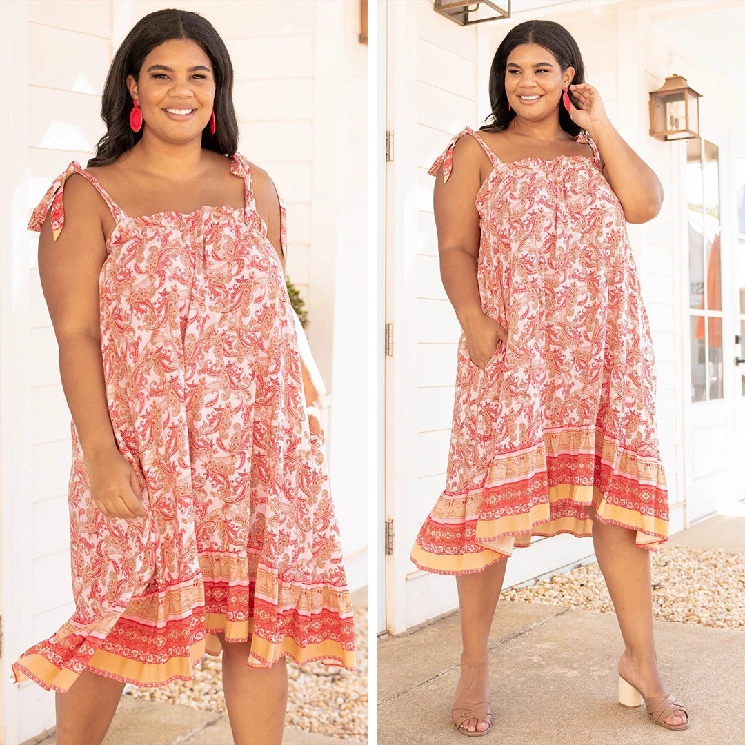 This dress will have you so stylish all season long! The pink color is super pretty and the paisley design is super in right now! This cutie has tie straps and an elastic neckline so you can have the comfiest fit! Style this with some heels and fun accessories for the perfect look!ย