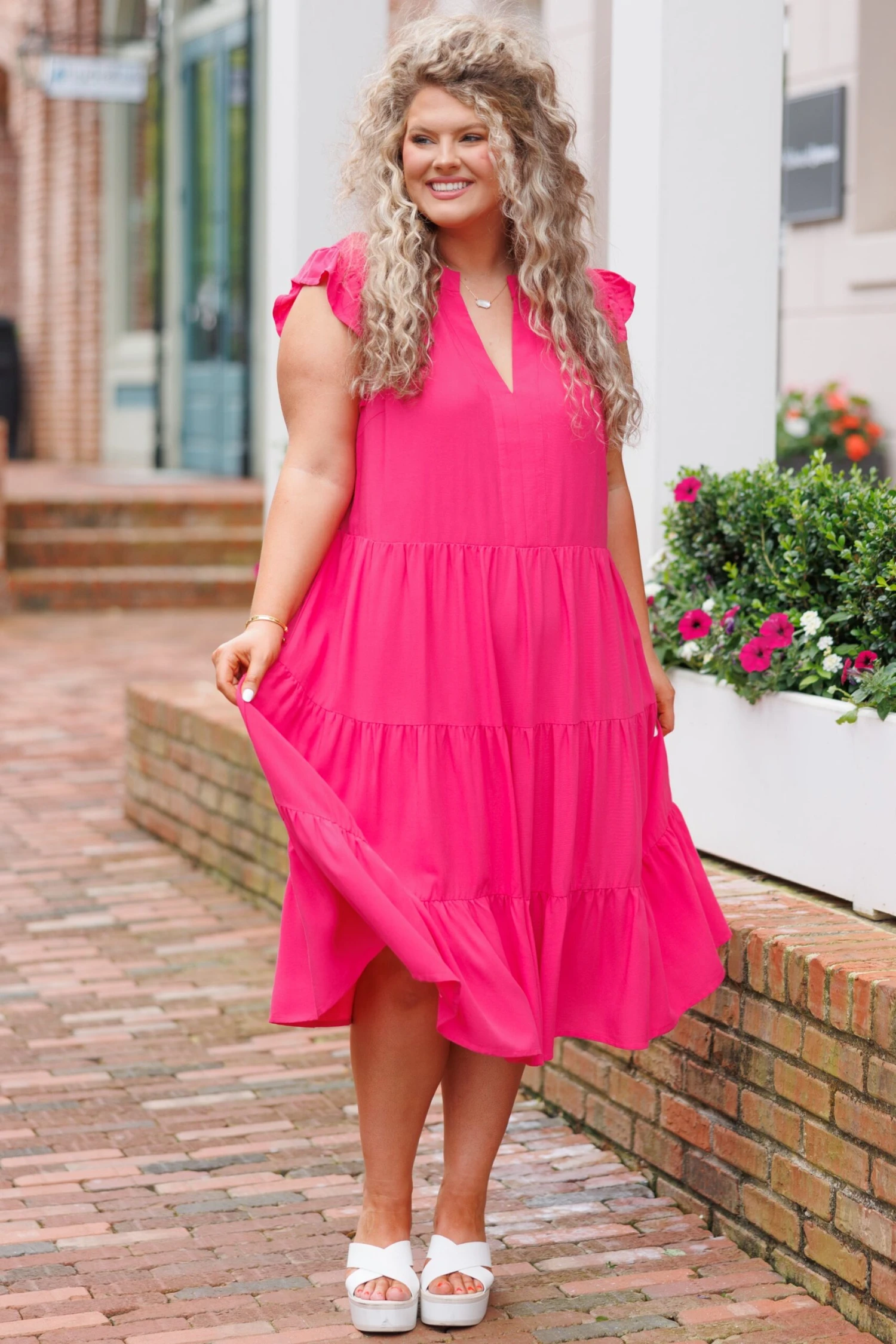 Adding this beautiful dress to your wardrobe won’t be a waste of time! Crafted with flutter sleeves and a hot pink color, this figure-flattering style is perfect for a day out on the town! The flowy fit provides an effortless, comfortable look for any occasion!