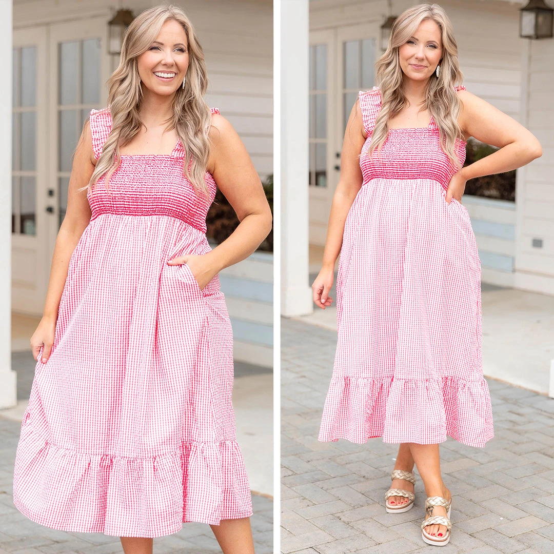 You and this dress would go together perfectly! It has a bold red color with a plaid pattern that is so trendy and sweet! The smocked bodice and flowy fit are perfect for a day out on the town! Style this dress with heels or sandals for a classy chic look!
